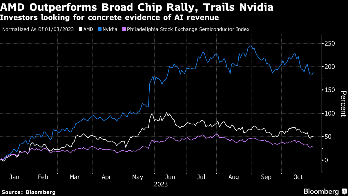 But the majority of questions for AMD will likely be on its new MI300 chip, which the firm has said will debut in the fourth quarter. How quickly the product wins customers is seen as key to the direction of the stock. AMD shares are up 47% this year, far ahead of the Philadelphia semiconductor index but down significantly from June when exuberance about all things AI was running high.