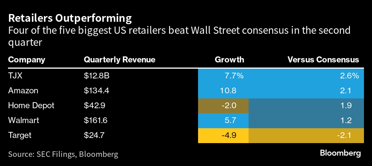 Walmart Inc., Target Corp. and Home Depot Inc. all topped Wall Street's profit estimates in their fiscal second quarters, which ended in late July. In that way, at least, the results reinforced the picture of a resilient consumer after US retail sales data for last month beat expectations, with gains across most major categories.