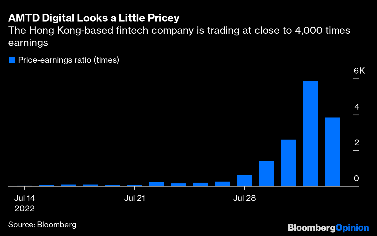 How does a three-year-old Hong Kong fintech company with 50 employees become worth almost four times as much as Goldman Sachs Group Inc. in less than a month? Because stonks go up, duh. AMTD Digital Inc. has risen 14,000% since listing in New York, giving it a market value of more than $470 billion at one point this week and earning comparisons with the poster child of meme stocks, GameStop Corp. AMTD is a very different phenomenon, though.