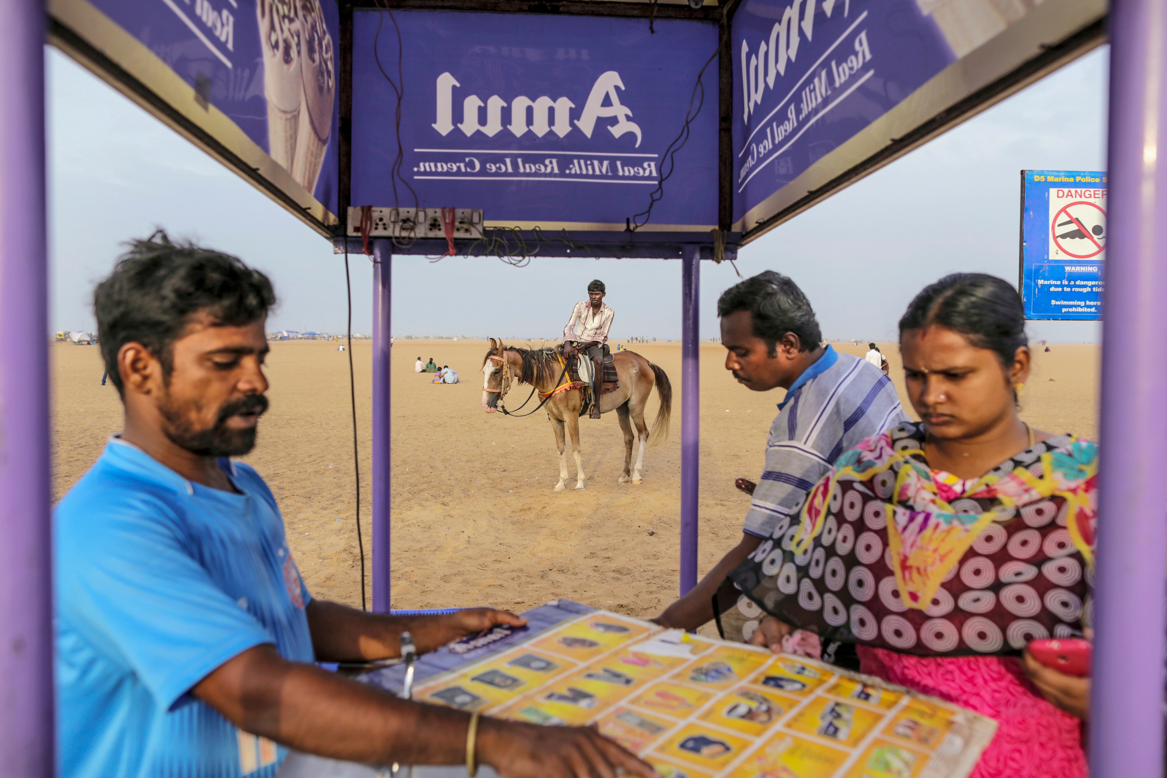 Amul ice-cream vendor shows a menu of ice creams to a customer. (Photographer: Dhiraj Singh/Bloomberg)