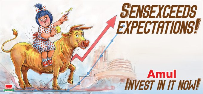 The Amul girl cheering BSE Sensex crossing 60,000 in September 2021. (Image: Amul Twitter handle)