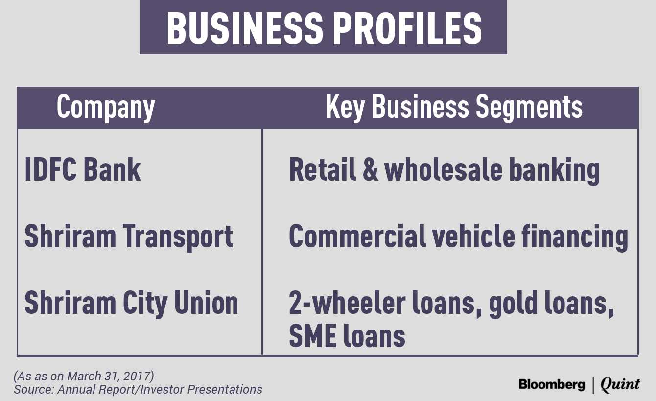 Shriram Transport Finance is mostly in the business of commercial vehicle financing and construction equipment financing. Shriram City Union does small business financing and gold loans, along with offering other retail products. IDFC Bank, meantime, has an inherent strength in corporate lending but no meaningful presence in retail.