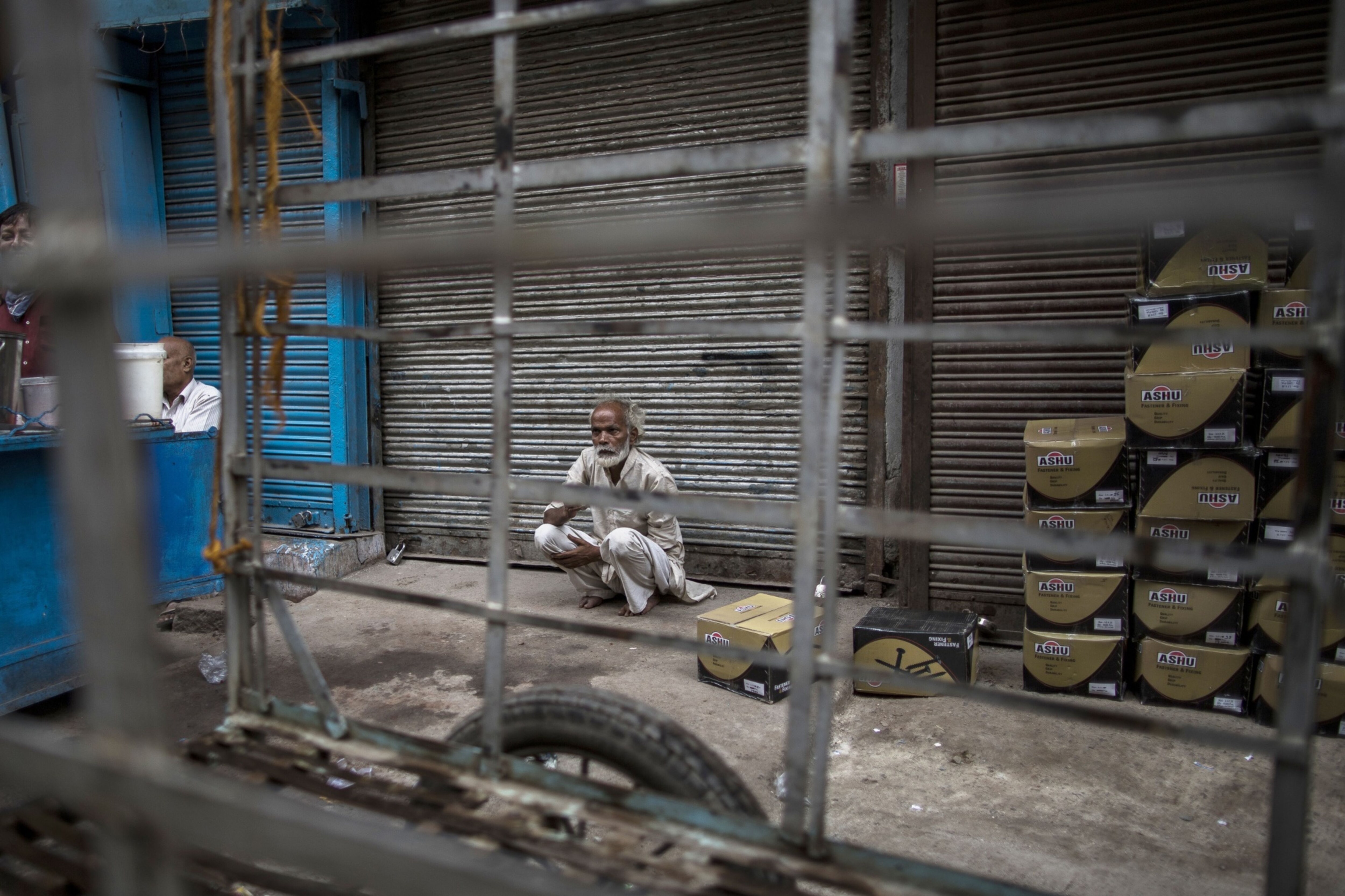 People gesture for food while waiting in a bus during a lockdown in New Delhi, India. (Photographer: Prashanth Vishwanathan/Bloomberg.)