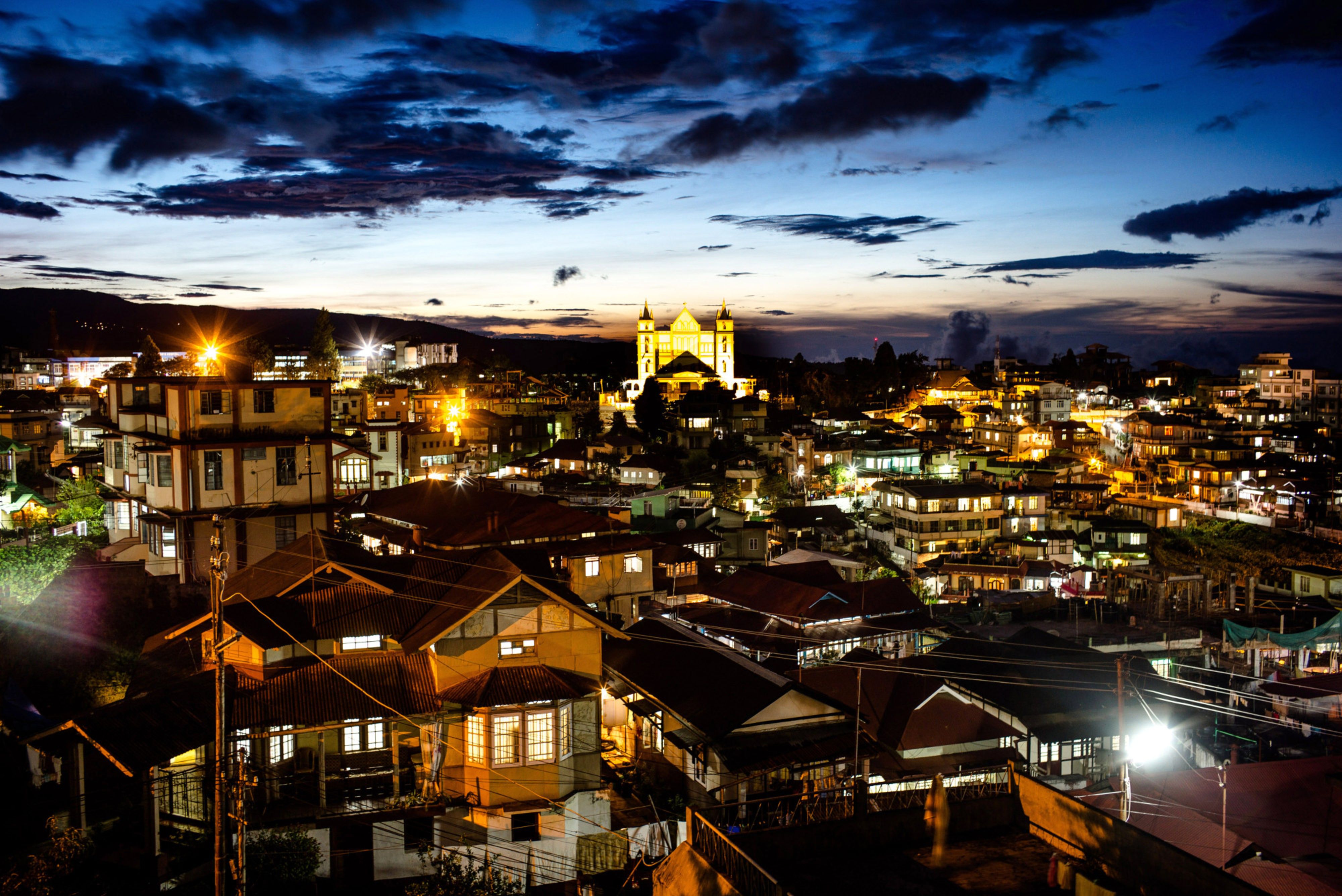 A church stands illuminated among other buildings in Shillong, Meghalaya. (Photographer: Sanjit Das/Bloomberg)