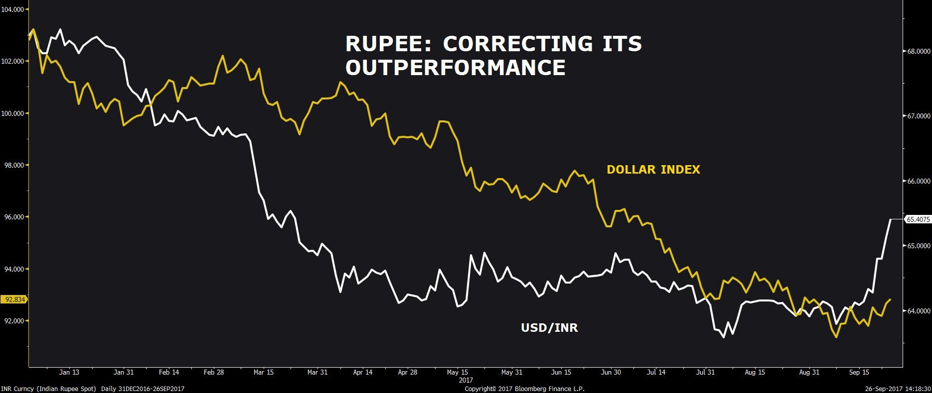 What we are seeing now is a reversal of that trend with the rupee weakening even though the dollar has remained mostly steady.