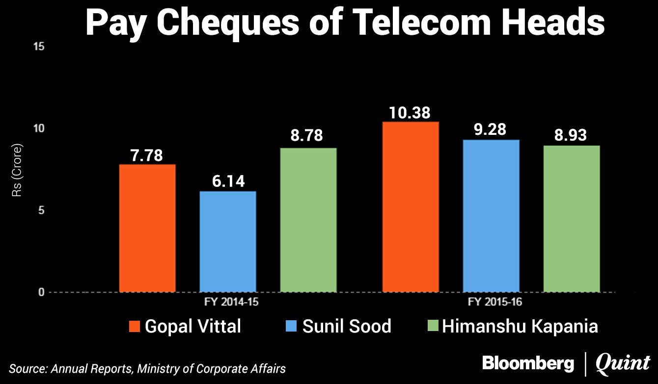 Idea Cellular Ltd.'s Managing Director, Himanshu Kapania was the lowest paid while Vodafone India's Managing Director and Chief Executive Officer, Sunil Sood, took home the second highest salary. Bharti Airtel Ltd's. Managing Director and Chief Executive Officer, Gopal Vittal, walked home with the highest package in the financial year 2015-16.