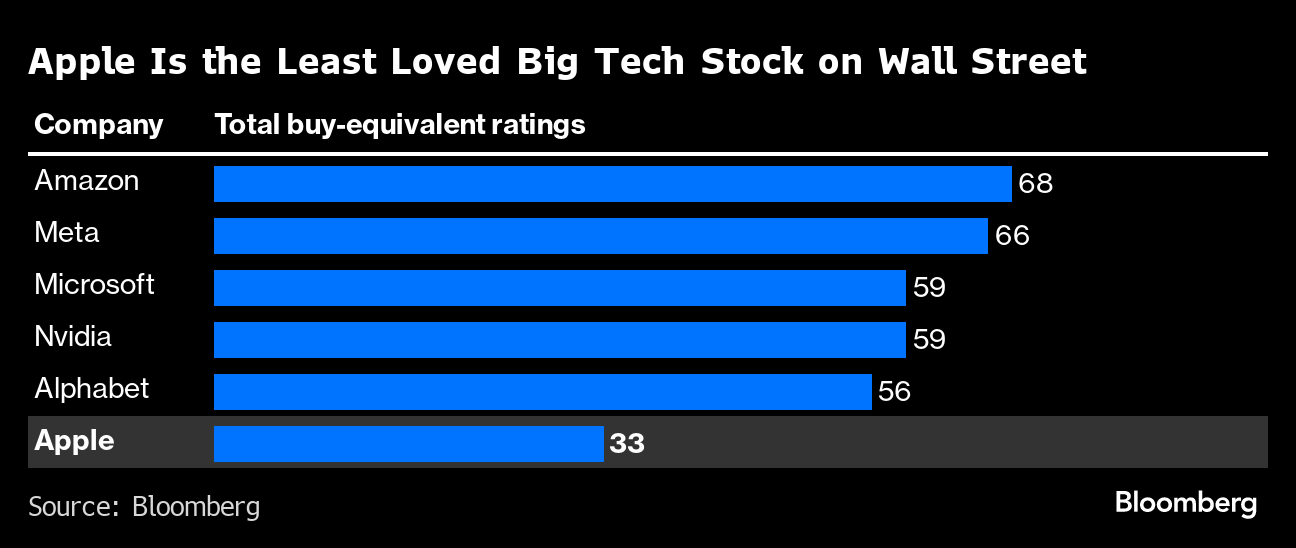 Nearly unanimously bullish on big tech, Wall Street is more cautious when it comes to Apple. The stock has attracted only 33 buy-equivalent recommendations. That pales in comparison to Amazon.com Inc.'s 68, Meta Platforms Inc.'s 66 and the 59 bullish ratings for Nvidia Corp.