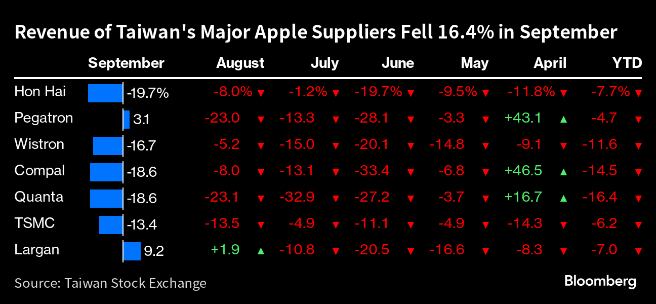 (Bloomberg) -- Apple Inc.'s key suppliers in Taiwan saw another major sales drop in September, despite the launch of a new iPhone and several Android handsets.