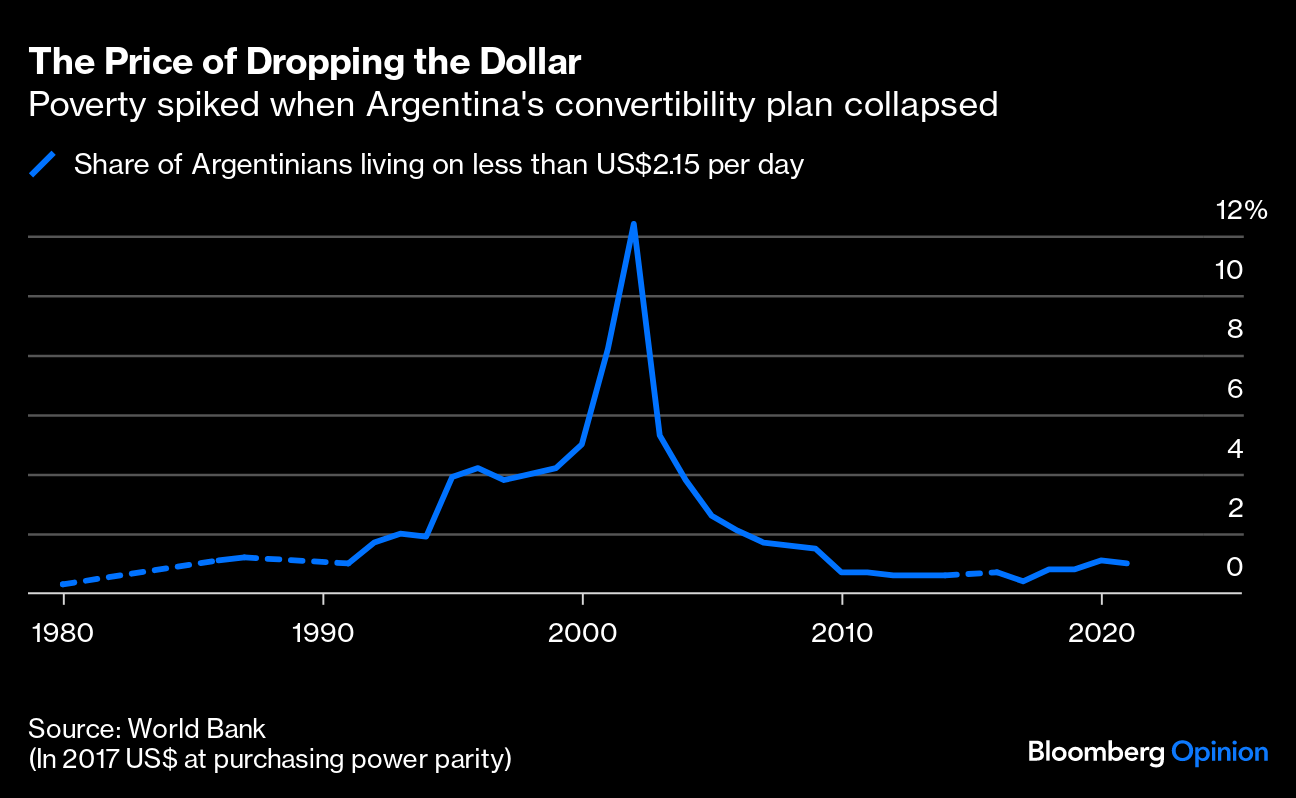 The proposal has received enthusiastic support from economists on the libertarian end of the profession, including a fellow Bloomberg columnist who argues that whatever the economic costs of adopting the dollar, nothing can be as bad as the mess Argentina is in now. Losing policy space to adapt to economic fluctuations, usually the most problematic side effect of ditching your currency, should, in this case, be viewed as a plus.