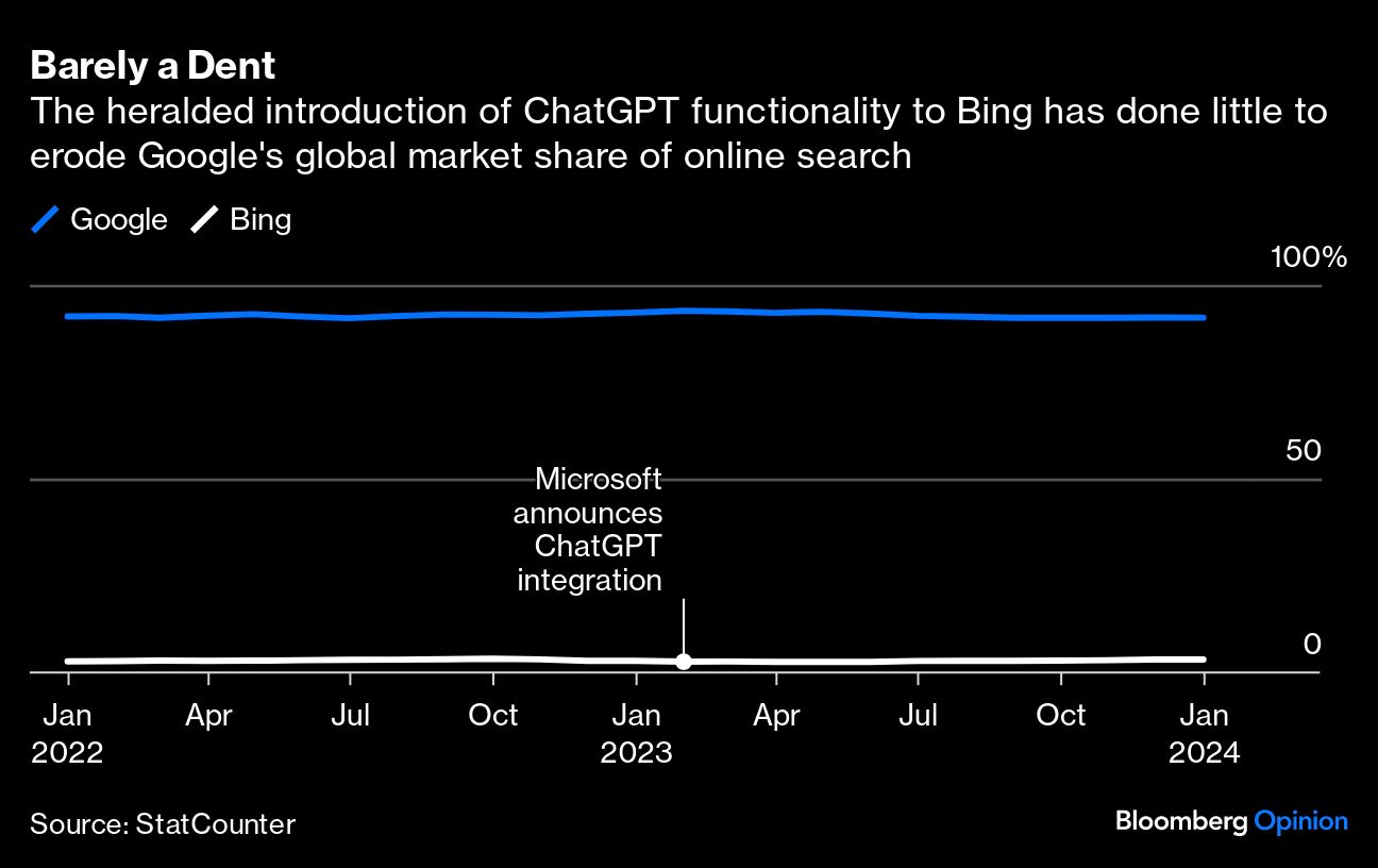 (Bloomberg Opinion) -- We've had almost a year now to assess whether Microsoft Corp.'s plan to add ChatGPT to its Bing search engine made any difference in the great battle against Google. It will come as no surprise to learn that it didn't — Bing's market share in online search has barely moved.
