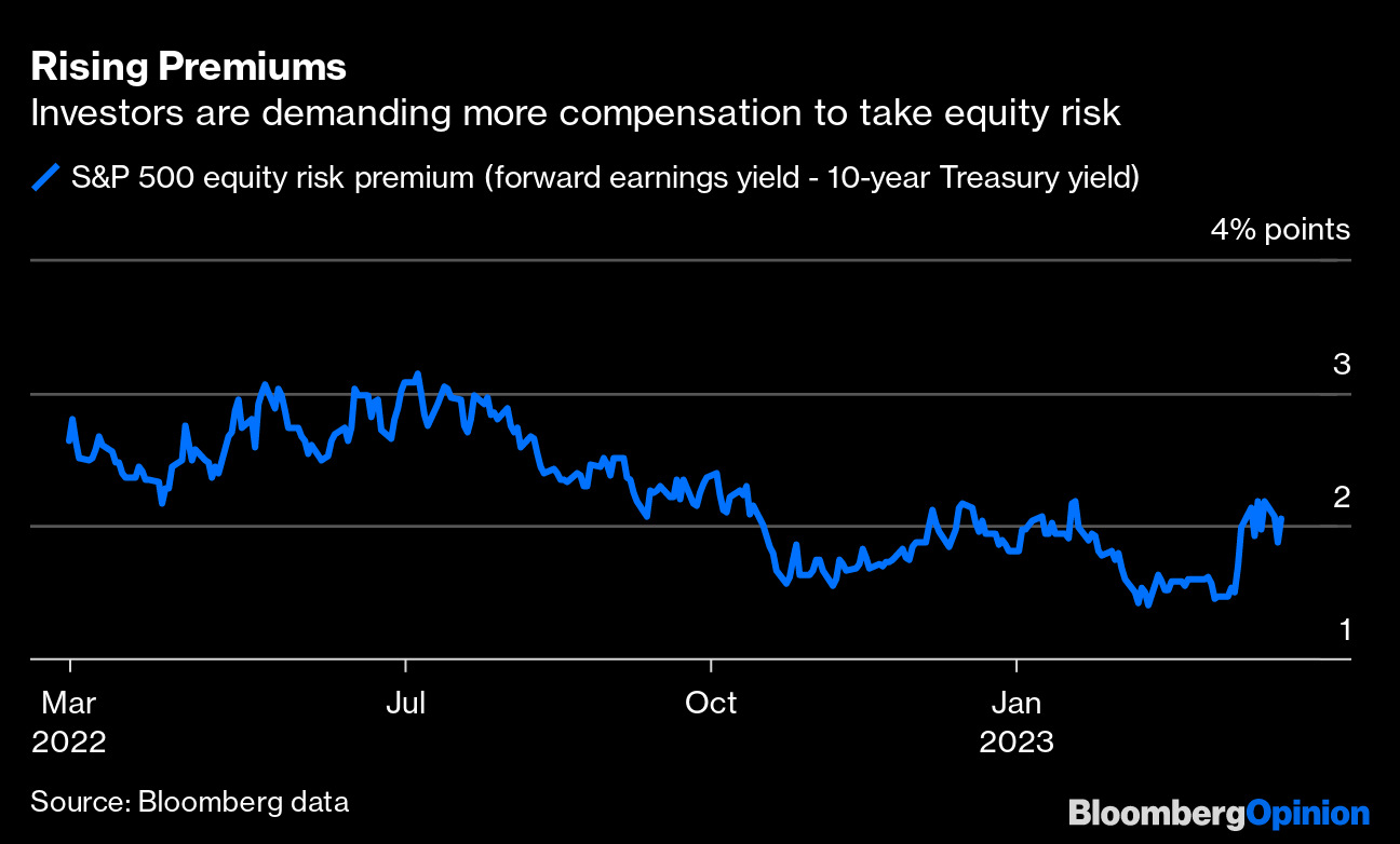 That new language helped bring Treasury yields sharply lower. In the past, such a move would have lit a fire under US stocks, but instead the S&P 500 Index fell 1.6%, with equity risk premiums rising higher on the day. All industry groups closed in the red, led by banks and real estate investment trusts. (Treasury Secretary Janet Yellen contributed to the selloff by saying regulators aren't looking to provide blanket deposit insurance to stabilize the banking system.)