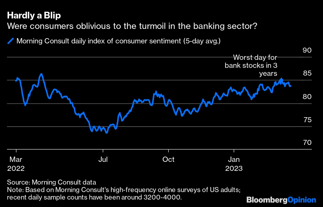 Granted, that doesn't mean that a recession is imminent. It is still conceivable that the banking sector turmoil will cool further and that the US economy will muddle along awhile. Households and companies are still cushioned by relatively strong balance sheets, and one high-frequency measure of consumer sentiment from decision intelligence company Morning Consult shows attitudes were hardly dented by the recent market mayhem. (Another March 10-13 survey from the same company did, however, show a jump in concern about job and income stability.)