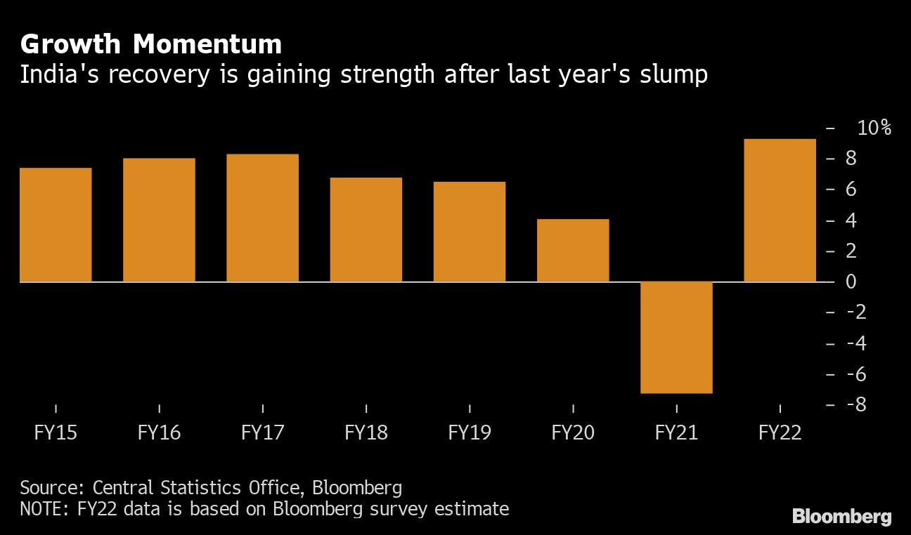 The recovery is “led by the services sector, with individual mobility back to pre-Covid levels, and ultra-accommodative financial conditions,” as well as higher government expenditures, said Gaura Sen Gupta, an economist with IDFC First Bank in Mumbai, forecasting growth of 10% this year.