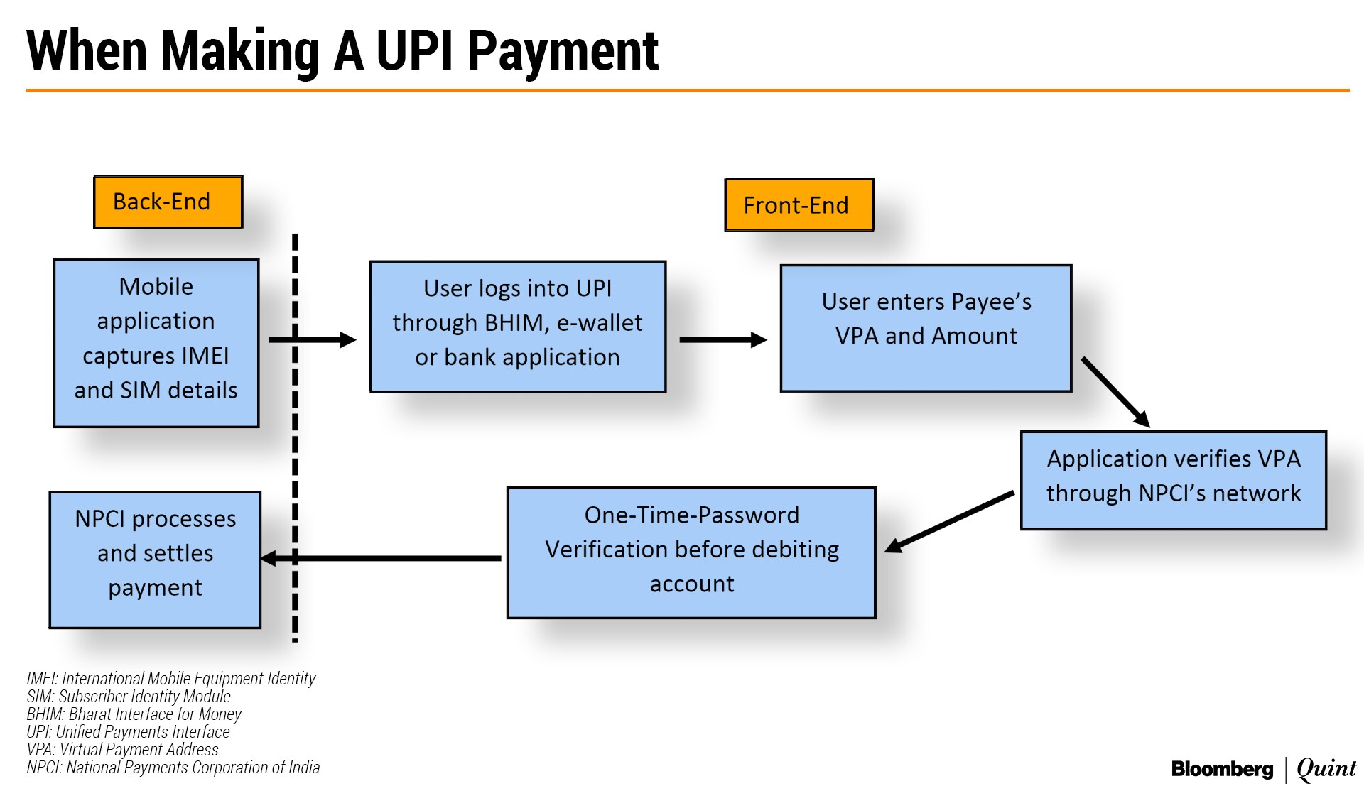 The UPI platform has two payment functions - push and pull. When a person initiates a payment, that is when a payer pays the payee via UPI, this is called a push transaction. The process followed in that transaction is explained below: