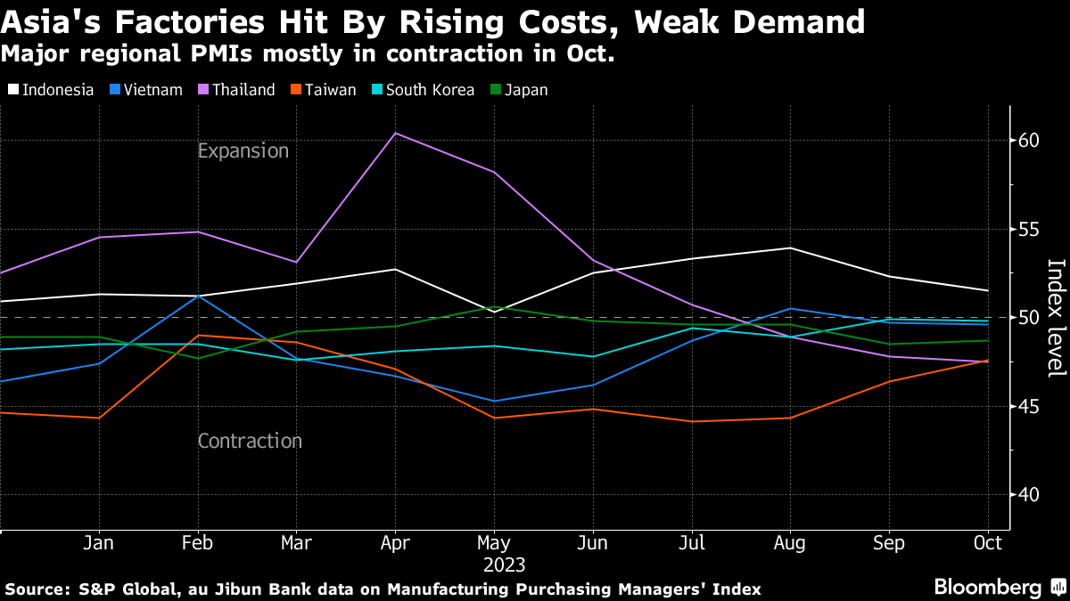 (Bloomberg) -- Manufacturing activity in Asia slumped again in October as conflict in the Middle East drove oil prices higher, costs rose and global demand remained under pressure.