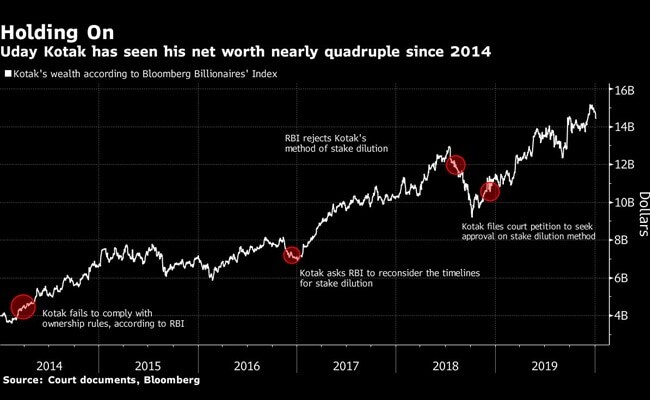 Uday Kotak's wealth has risen by about 27 per cent since December 10, 2018, when the bank filed the petition in court. Representatives for the RBI and Kotak Mahindra Bank didn't reply to emails seeking comment.