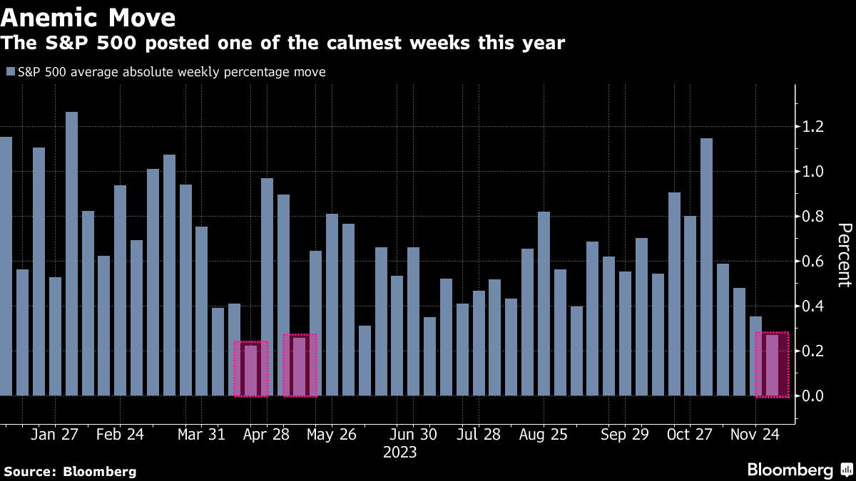 The S&P 500 posted an average daily move of 0.3% in either direction last week — its tamest swings in half a year — as the market lost some momentum toward the end of its second-best November since 1980. The Cboe Volatility Index, also known as the VIX, approached this year's lowest levels last Friday after Fed Chair Jerome Powell gave his clearest signal yet that officials have finished raising interest rates.