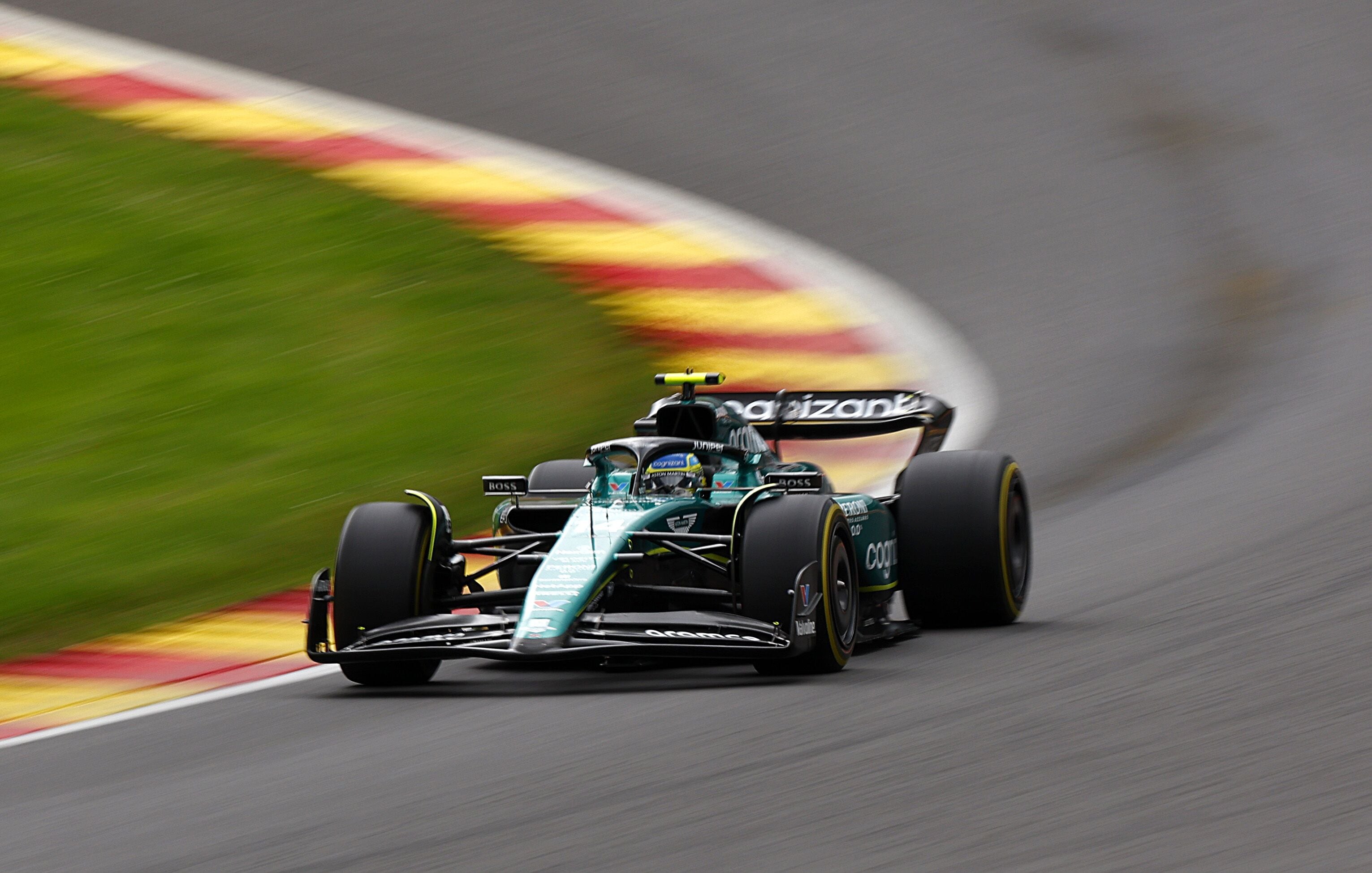 Fernando Alonso of Spain driving the (14) Aston Martin AMR23 Mercedes on track during the F1 Grand Prix of Belgium at Circuit de Spa-Francorchamps in Spa, Belgium. (Photo by Francois Nel/Getty Images)