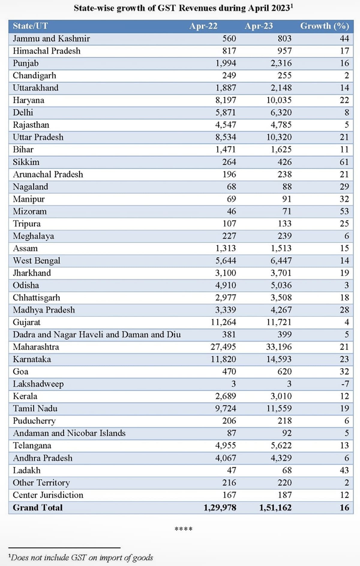 Gujarat collected Rs 11,721 crore in April 2023, against Rs 11,264 crore in the same month last year - a rise of 4 per cent. Haryana collected Rs 10,035 crore this April, against Rs 8,197 crore in the same month last year - a 22 per cent growth.