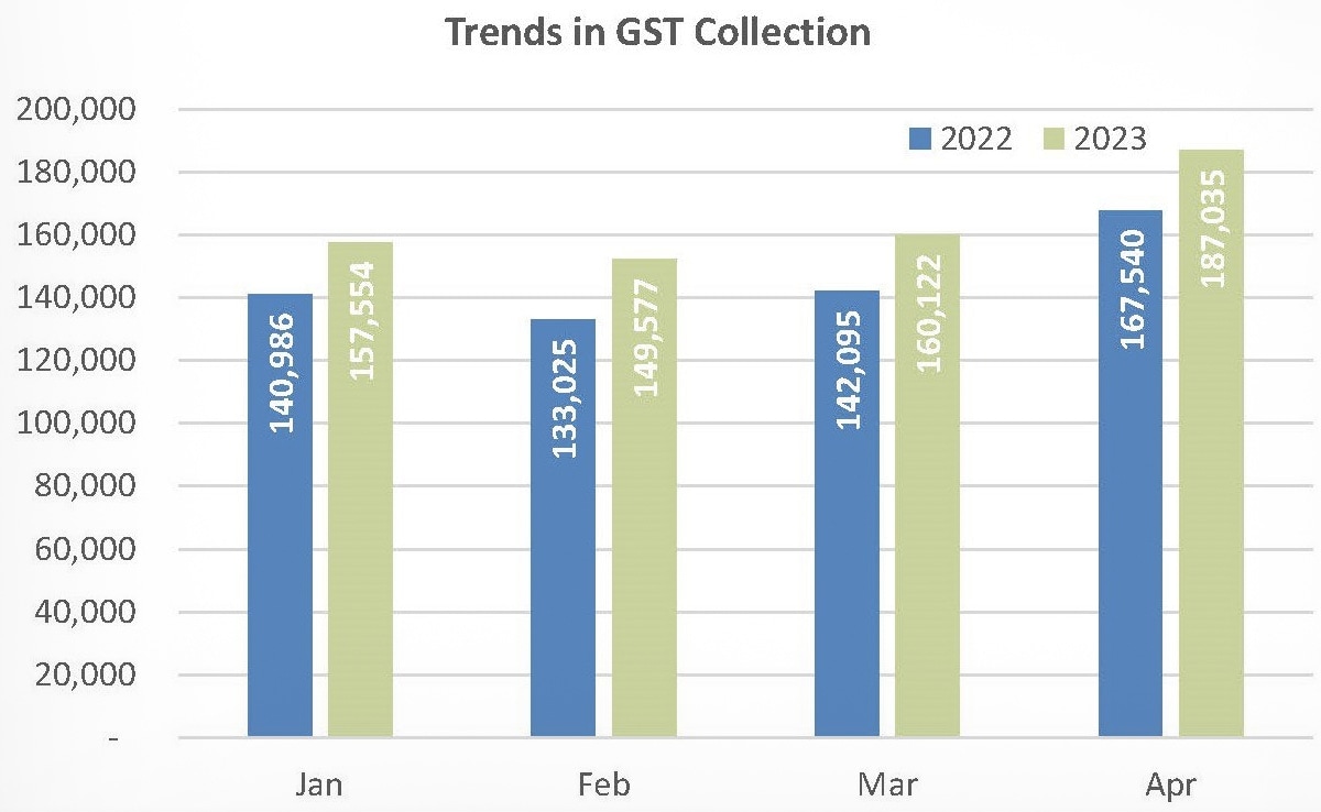 The goods and services tax (GST) revenue collection for April 2023 was the highest-ever at Rs 1.87 lakh crore, the government said today.