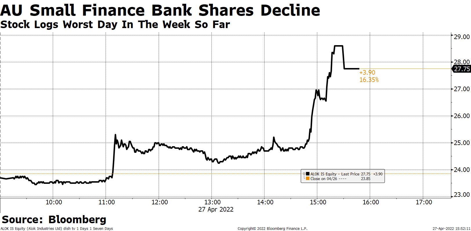 Shares of AU Small Finance Bank fell over 5% intraday and closed with 3.72% losses on Wednesday. Trading volume on the stock is nearly twice the 30-day average. Of the 27 analysts tracking the lender, 17 maintain a 'buy', six suggest a 'hold' and four recommend a 'sell', according to Bloomberg data. The average of the 12-month target price implies an upside of 6.6%.