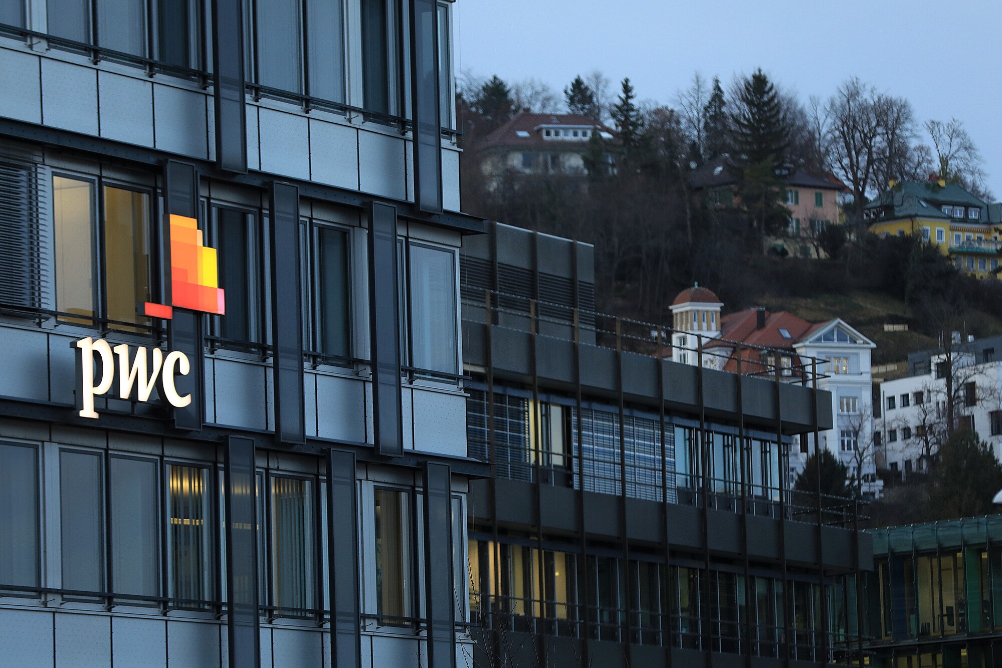 A logo sits illuminated on the offices of Pricewaterhouse Coopers International Ltd. (PwC) in Stuttgart. (Photographer: Krisztian Bocsi/Bloomberg)