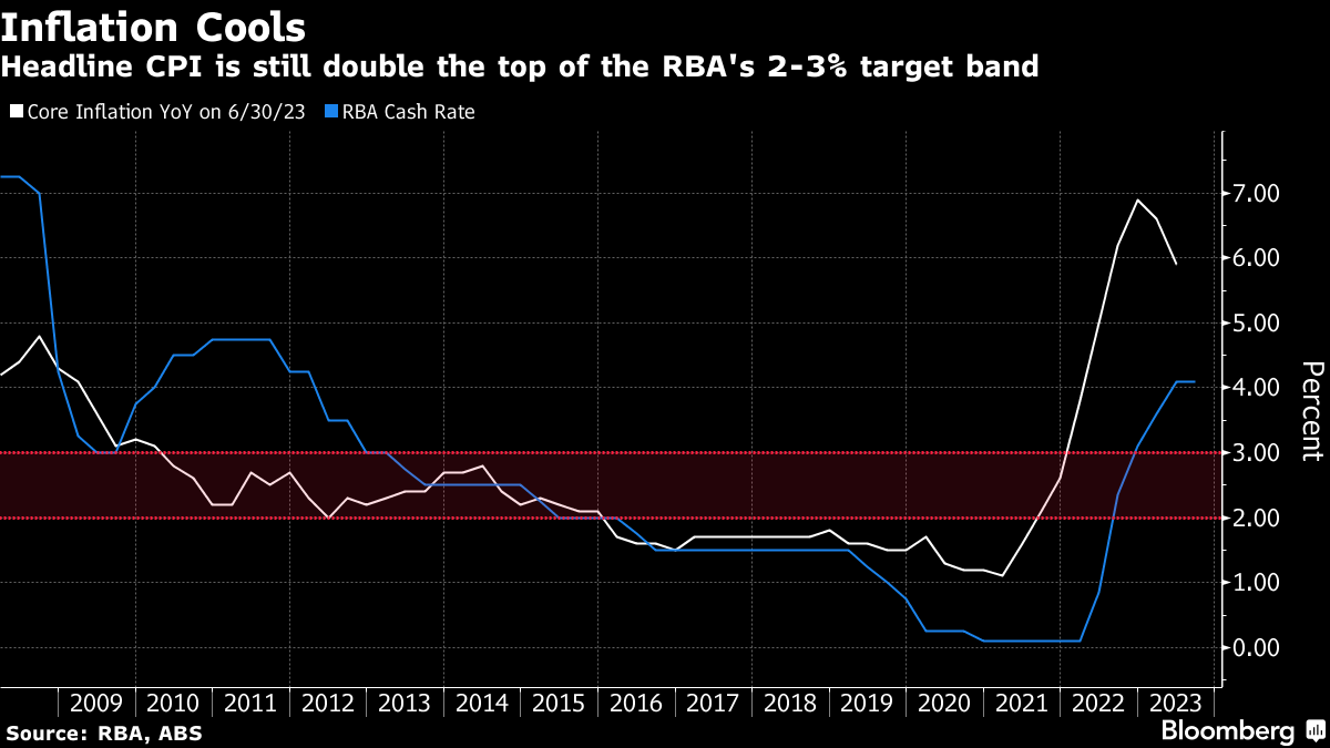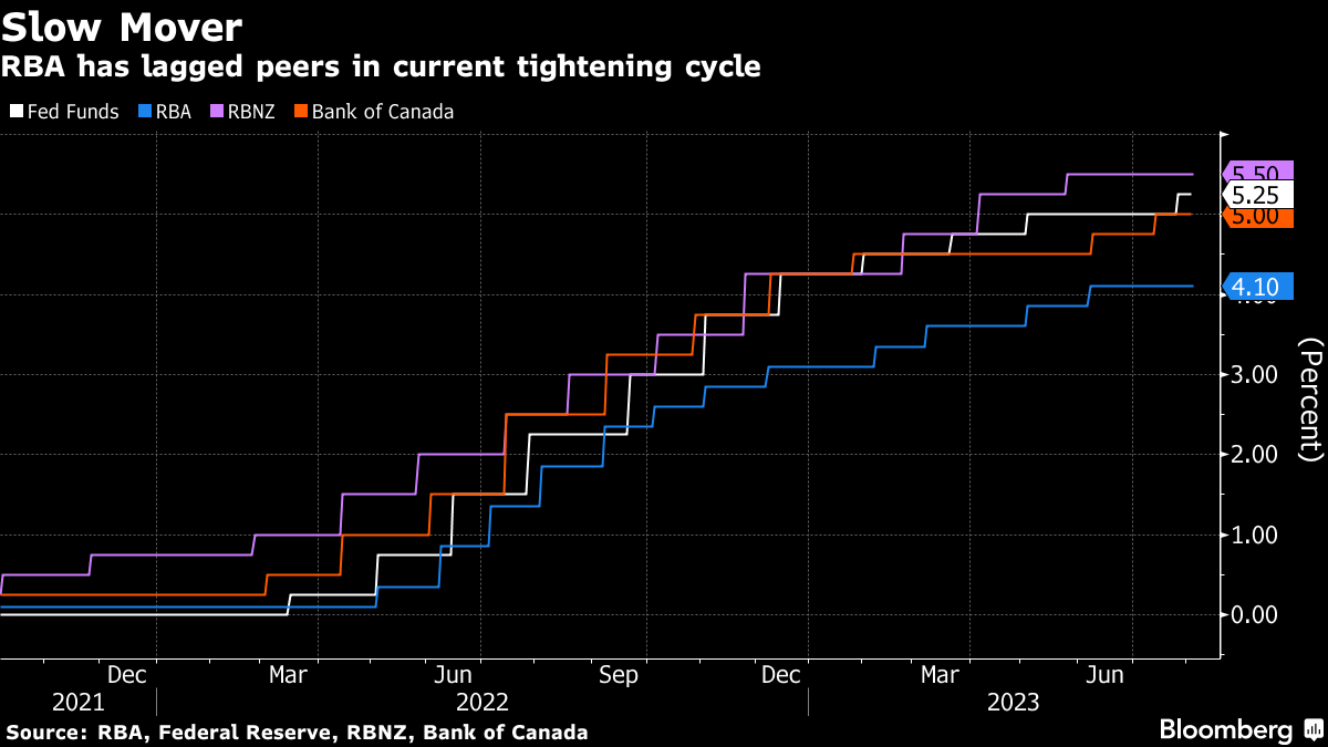 The RBA has been more circumspect than global counterparts during the current tightening cycle, underscoring its desire to engineer a soft landing while bringing inflation back to target. Australia has increased borrowing costs by 4 percentage points, well behind the 5.25 points from the Federal Reserve and nearby New Zealand.