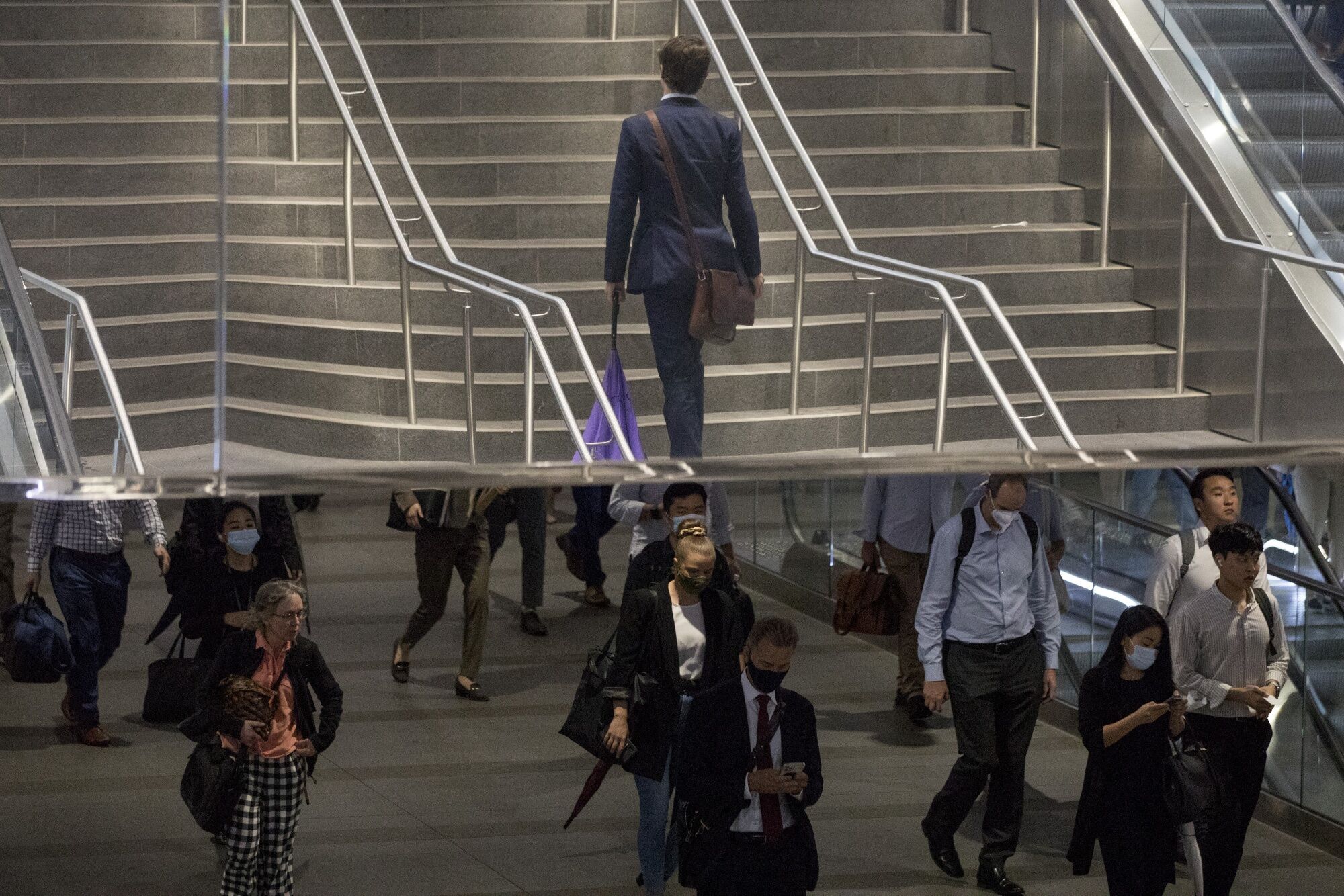 Pedestrians at a train station in Sydney, Australia, on Monday, Feb. 28, 2022. Australia is scheduled to release gross domestic product figures on March 2. (Photographer: Brent Lewin/Bloomberg)