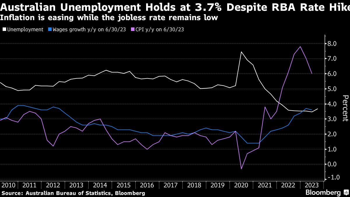 The economy added 64,900 roles from the prior month — driven primarily by part-time jobs — compared with estimates for a 25,000 gain, Australian Bureau of Statistics data showed Thursday. The jobless rate held at 3.7% as the labor force swelled, having hovered in a range of 3.4%-3.7% since June last year.