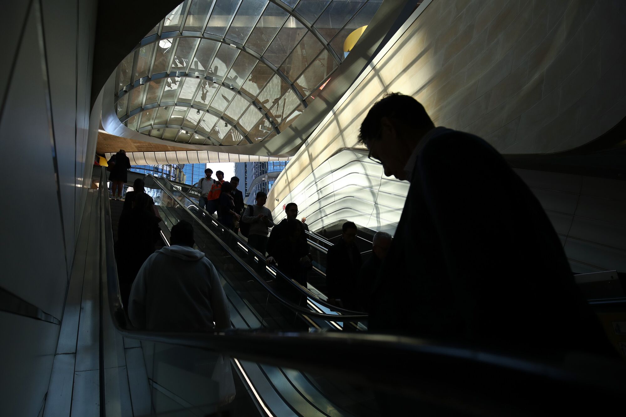Commuters ride escalators as they go through the Wynyard Walk pedestrian tunnel at Wynyard railway station in Sydney, Australia.