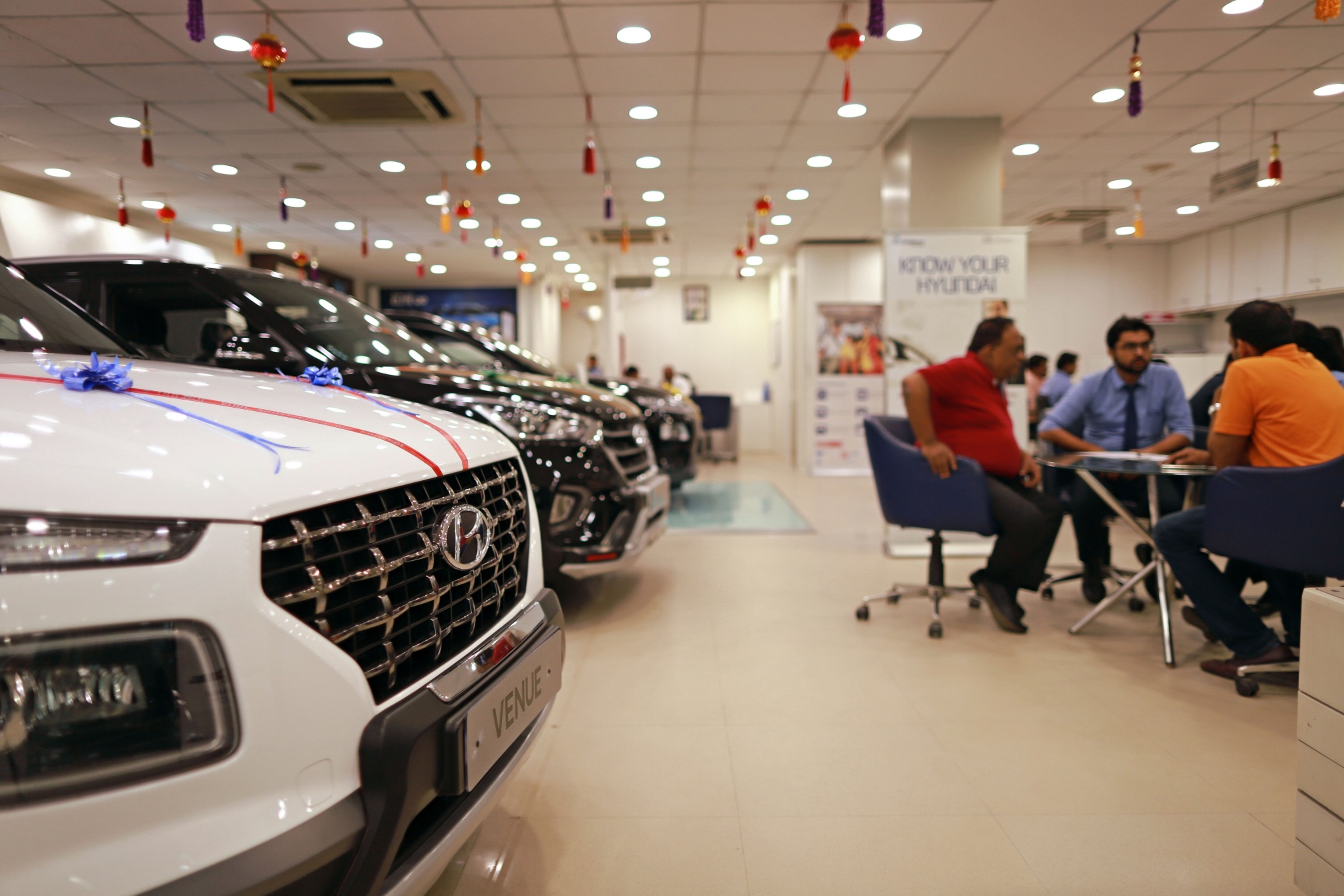 Hyundai Motor Co. vehicles stand on display as customers talk to sales representatives at the a company’s Koncept Hyundai showroom in New Delhi, India. (Photographer: Anindito Mukherjee/Bloomberg)