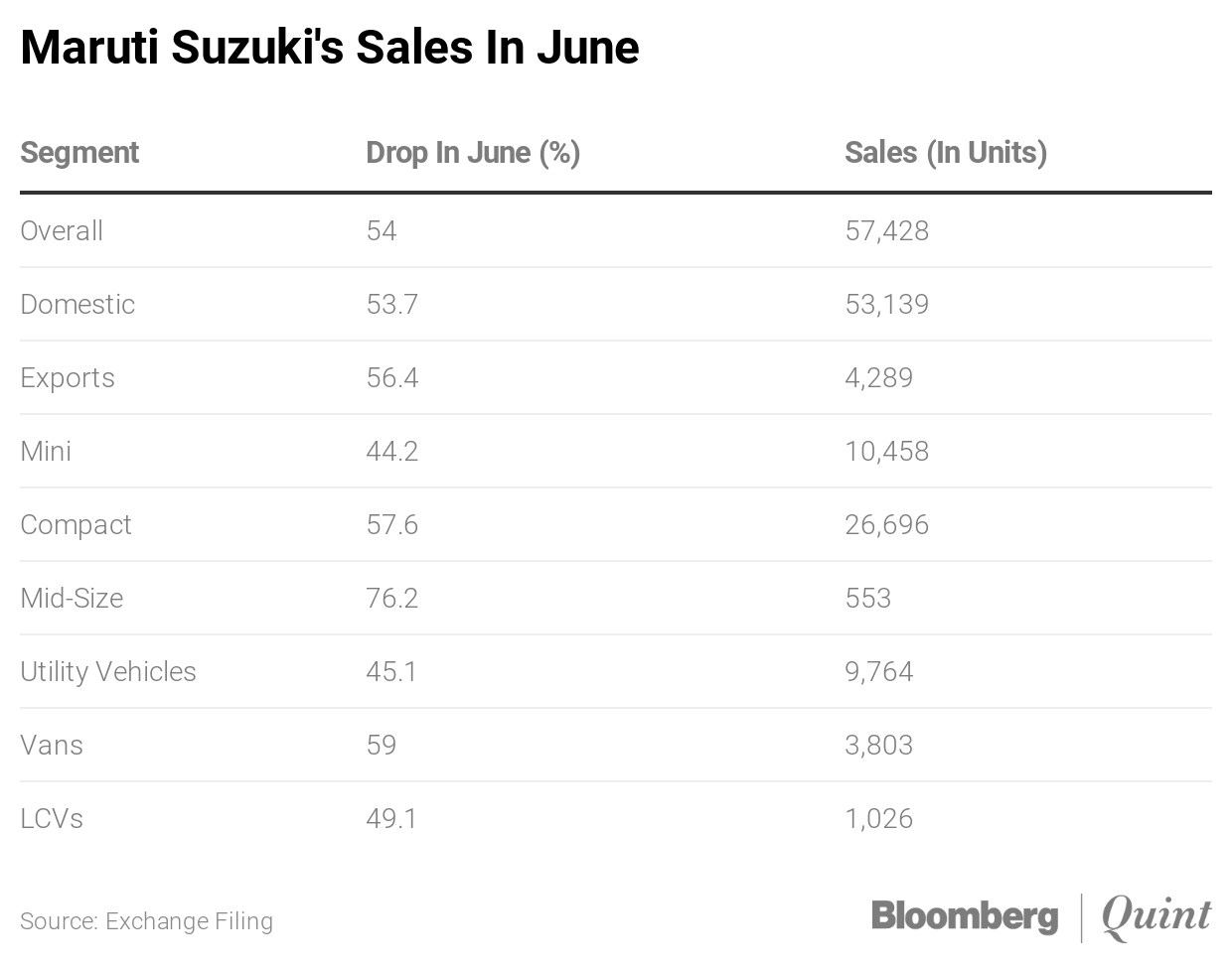 Total domestic sales of Tata Motors Ltd. fell 82% year-on-year to 23,845 units in the April-June quarter, the Mumbai-based automaker said in an exchange filing on Wednesday. The company had sold 1,31, 879 units a year ago.