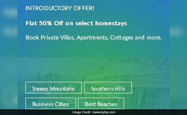 Another travel portal Makemytrip is offering a 50 per cent discount on homestays at popular tourist destinations like Shimla, Ooty, Coorg, Munar, Goa, Alibaug and Shillong. Makemytrip's offer can be availed by using coupon code 'INTRO50' on bookings made through its travel portal.
