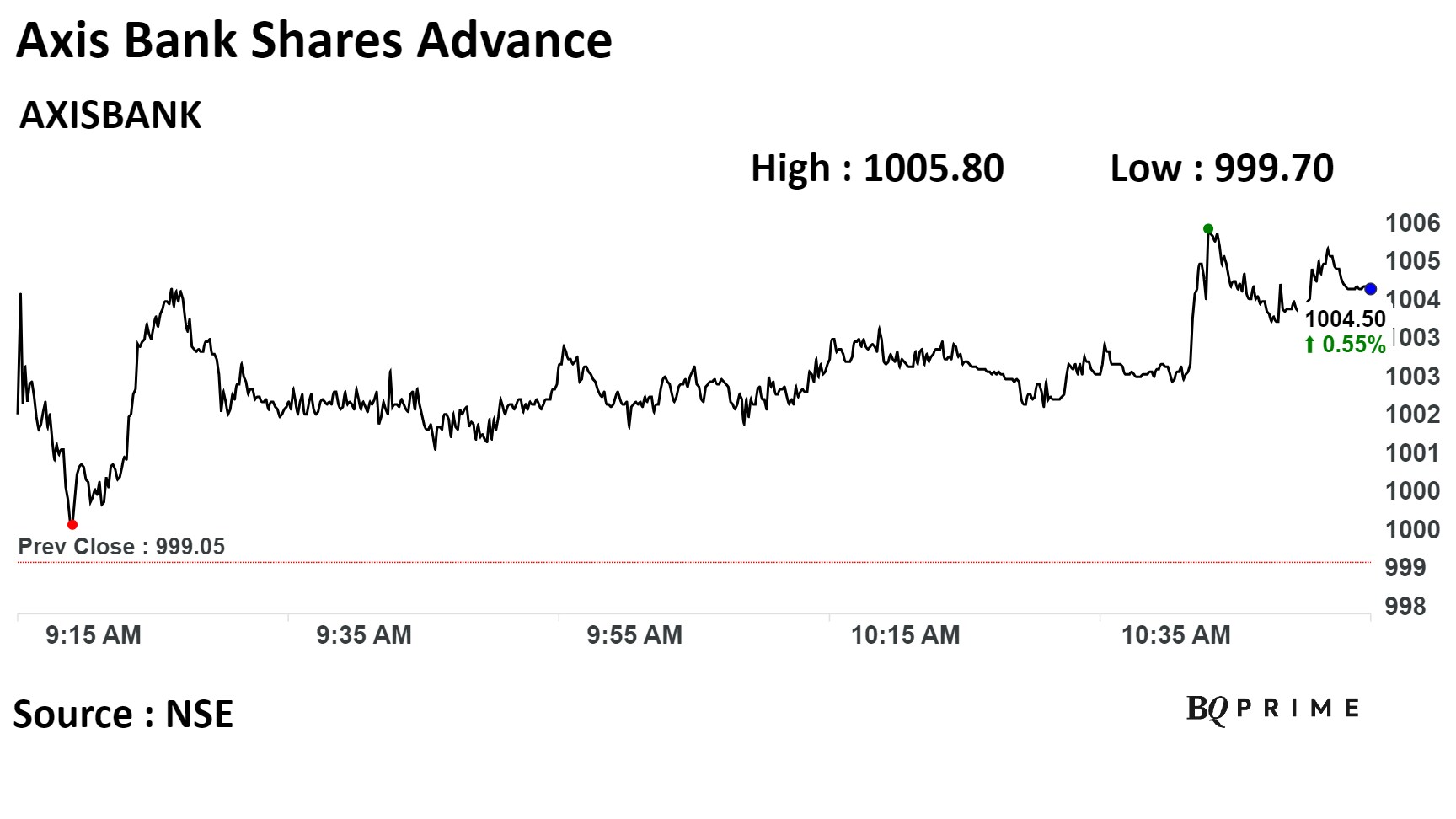 Shares of Axis Bank were trading 0.58% higher at Rs 1,004.85 apiece on the NSE, compared to 0.08% advance in Nifty 50 as of 10:54 a.m.