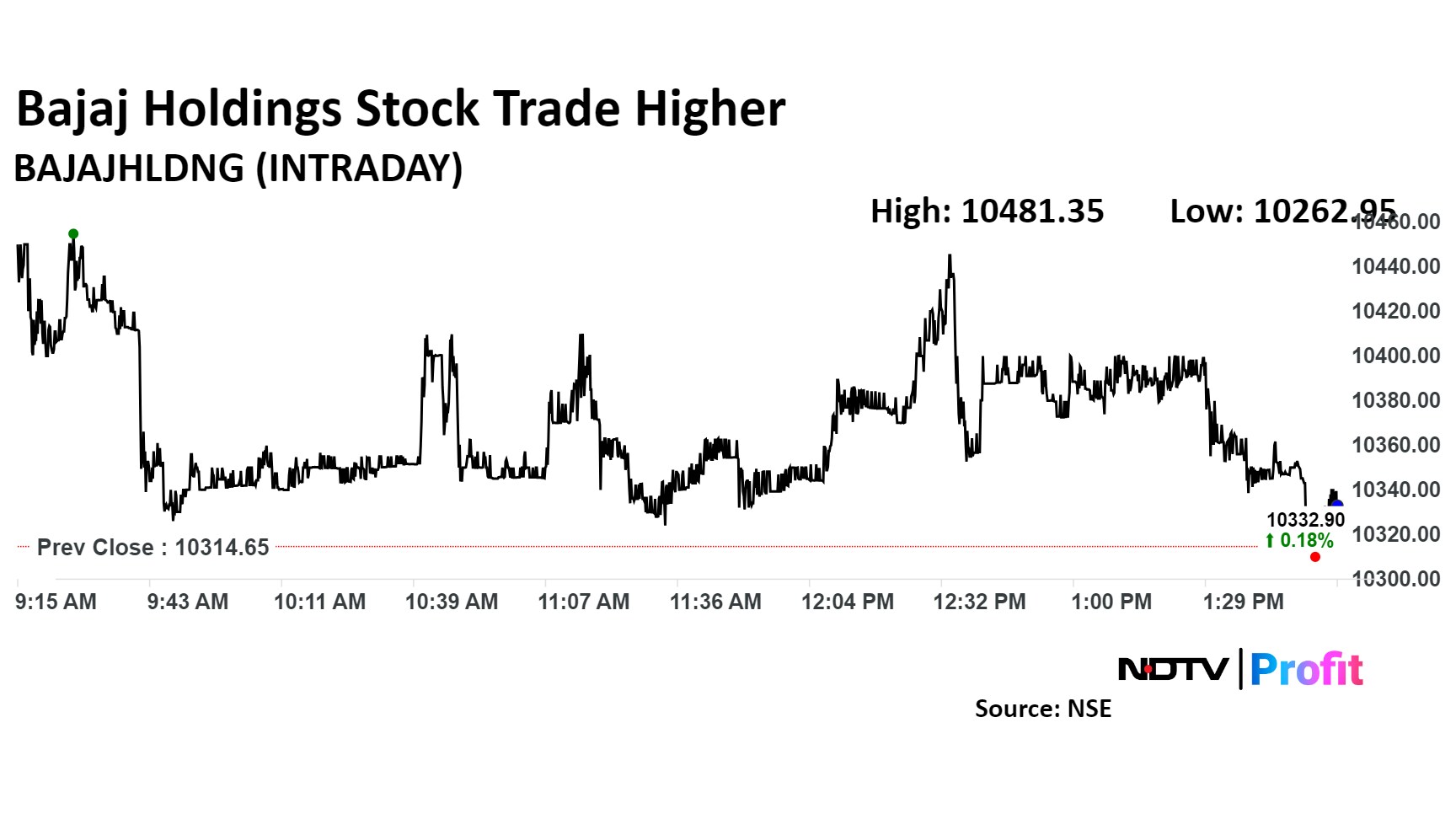 Shares of Bajaj Holdings advanced as much as 1.6% intraday to Rs 10,481 apiece. The scrip was trading 0.18% higher at Rs 10,322.9 by 1:35 p.m. The benchmark NSE Nifty 50 was trading 0.33% higher.