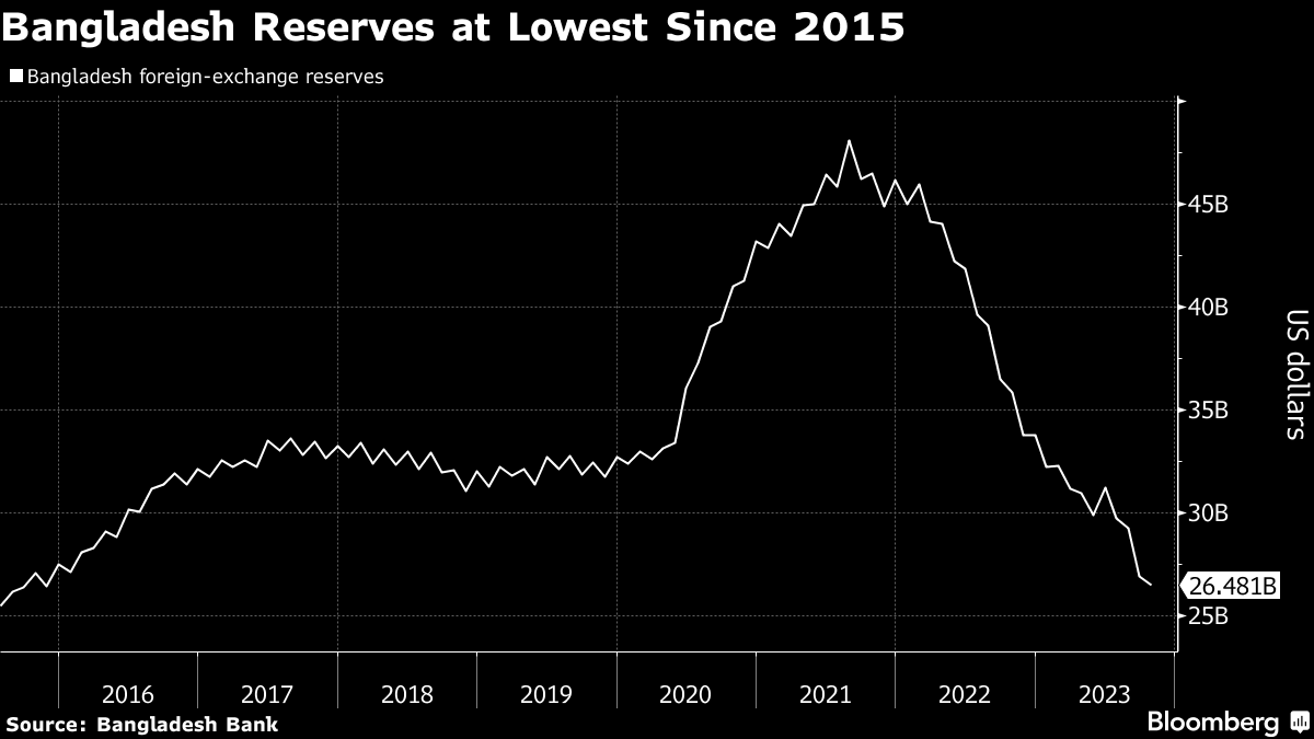 Bangladesh is facing a dollar liquidity squeeze, which prompted Fitch Ratings to cut the nation's sovereign rating outlook in September. The South Asian nation secured a $4.7 billion loan package from the IMF earlier this year to help boost its buffers.