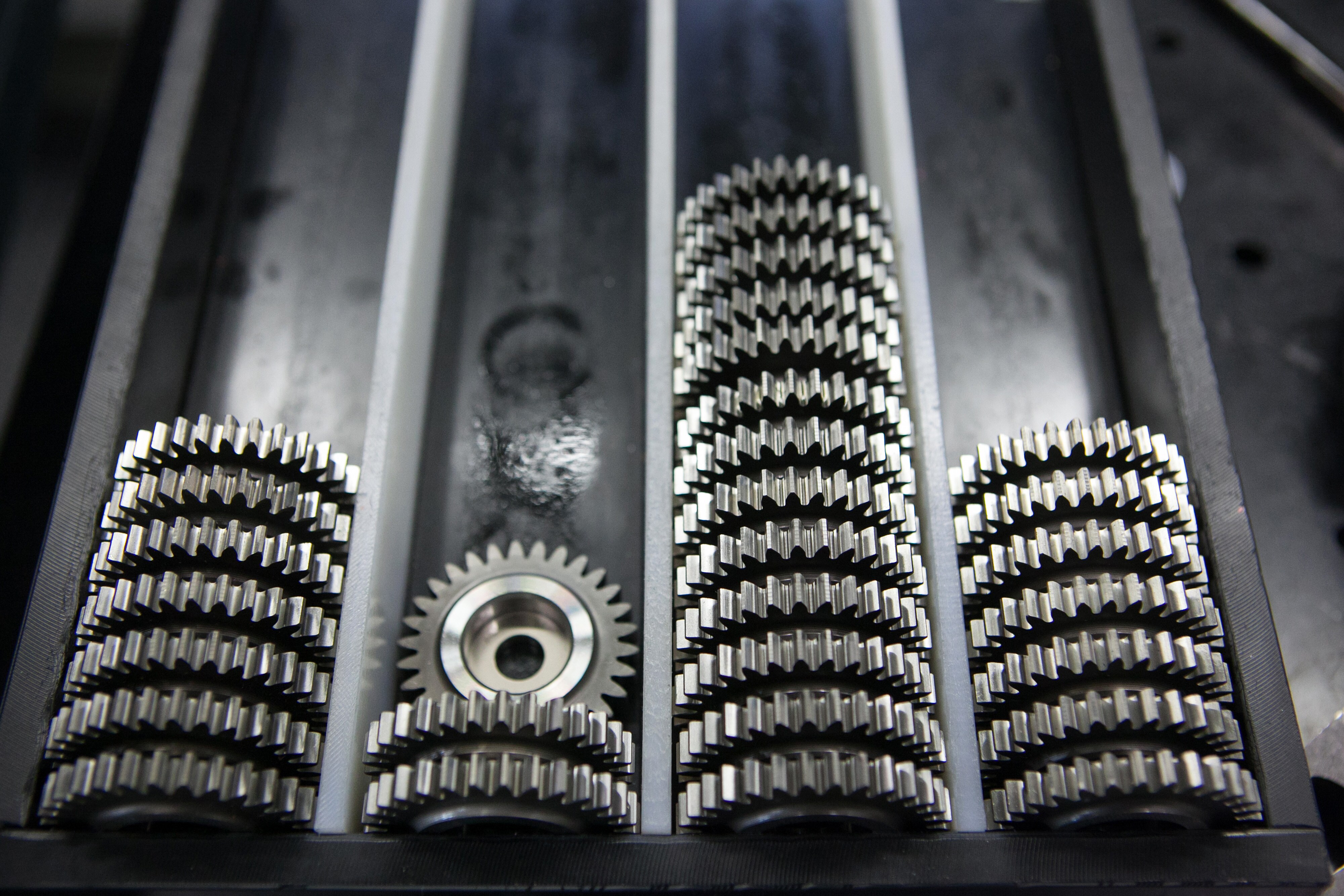 Cog wheels sit stacked before use at the Bayerische Motoren Werke AG (BMW) factory in Berlin, Germany (Photographer: Krisztian Bocsi/Bloomberg)