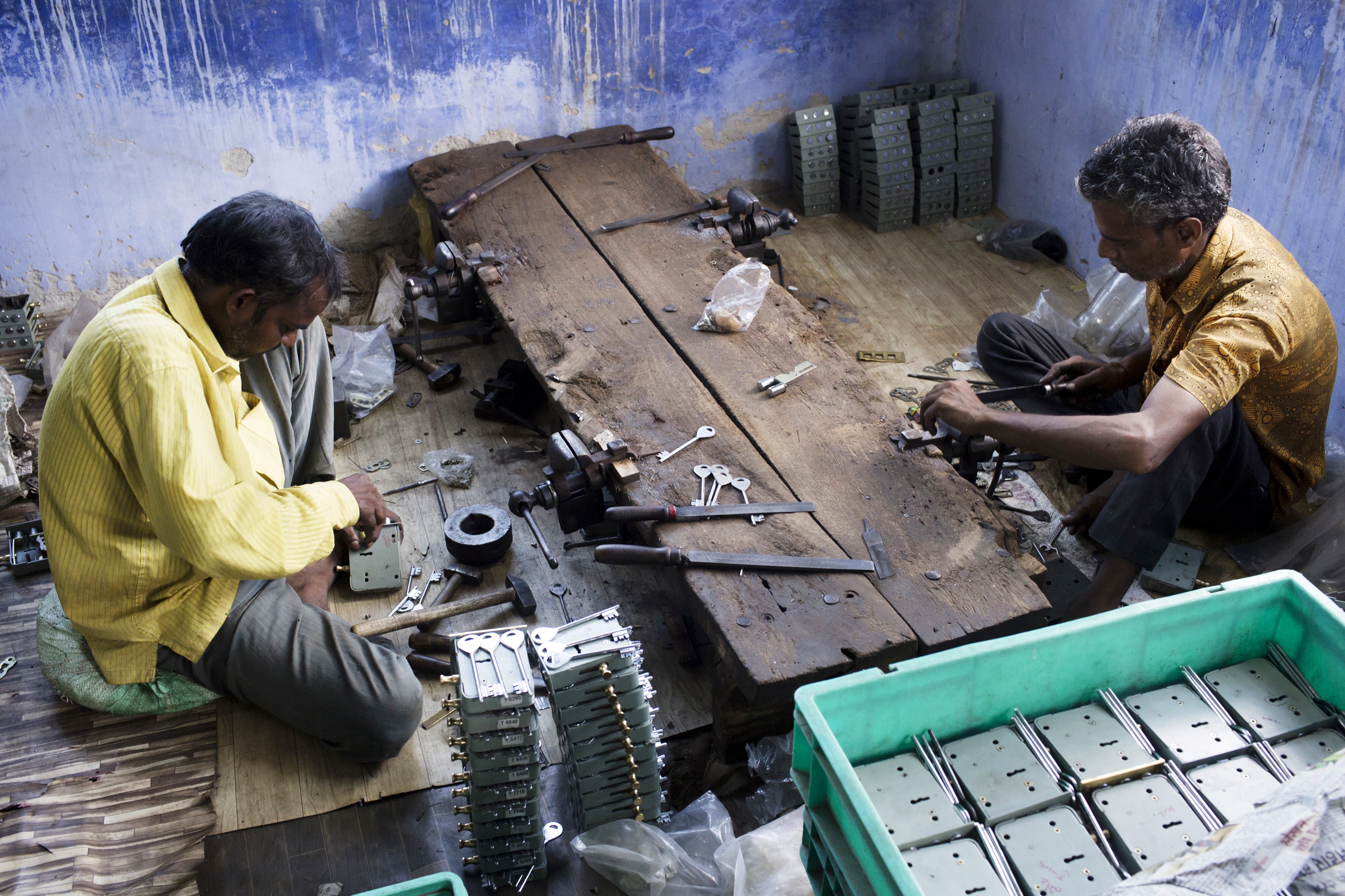 Workers at assemble and test twin-bolt locks at a Palam Locks & Hardware factory in the Tala Nagri Industrial Area of Aligarh, Uttar Pradesh. (Photographer: Udit Kulshrestha/Bloomberg)