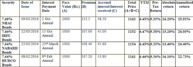 It is not surprising that the prices of tax-free bonds trading in the secondary market have witnessed a sharp rally. For example, the return in 7.69 per cent NHAI tax-free bonds, 7.64 per cent IRFC bonds and 7.64 per cent NABARD bonds have topped over 15 per cent. These bonds were issued earlier this year.
