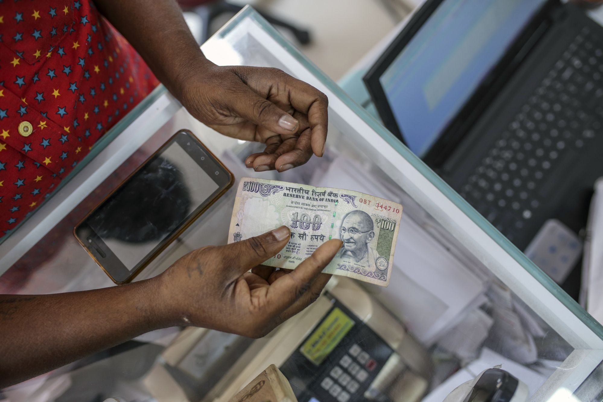 A customer holds Indian one hundred rupee banknote at the Mayuresh Watches and Traders watch and mobile phone store in the Byculla area of Mumbai, India, on Monday, Jan. 29, 2018.