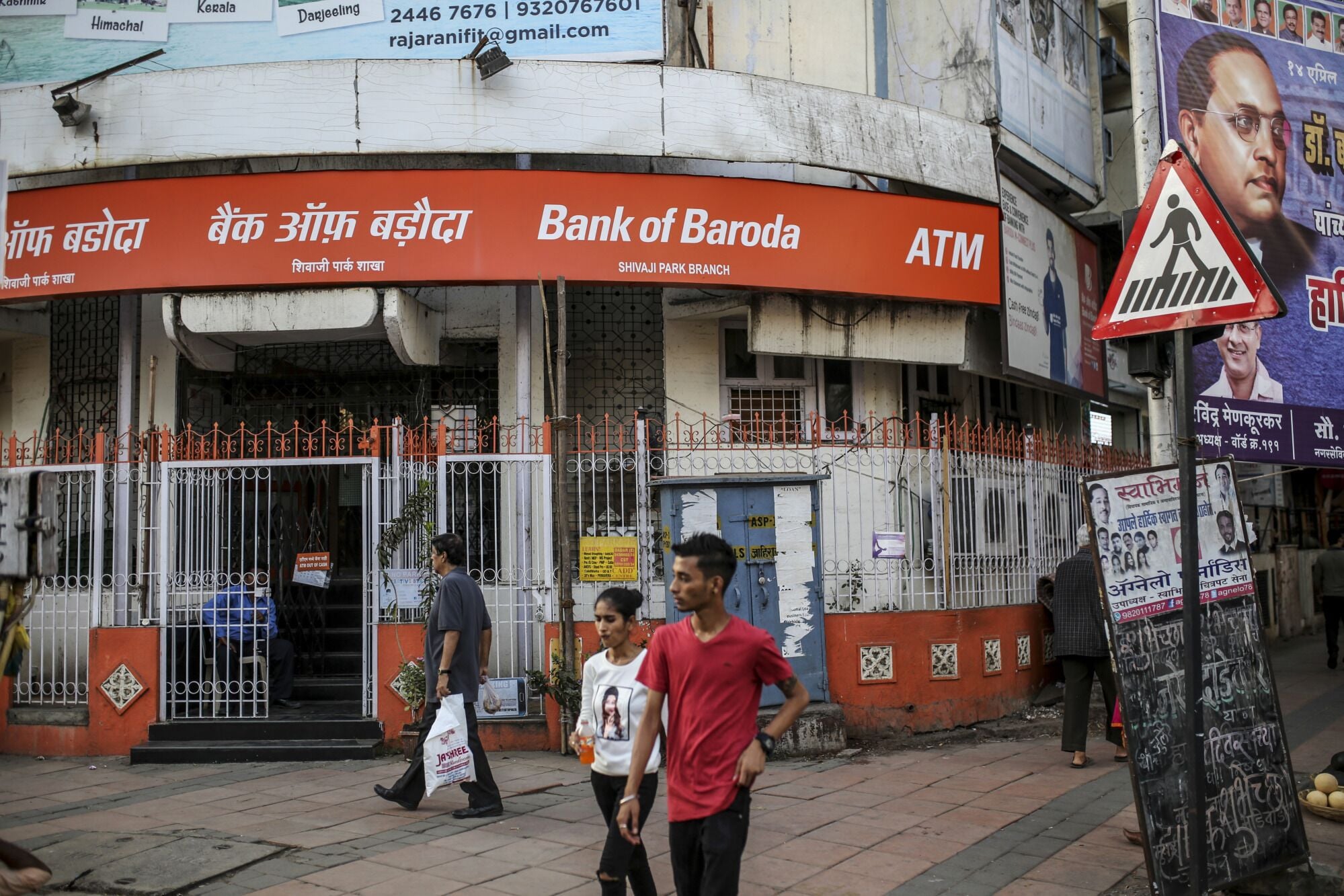 Pedestrians walk past a Bank of Baroda branch in Mumbai, India.