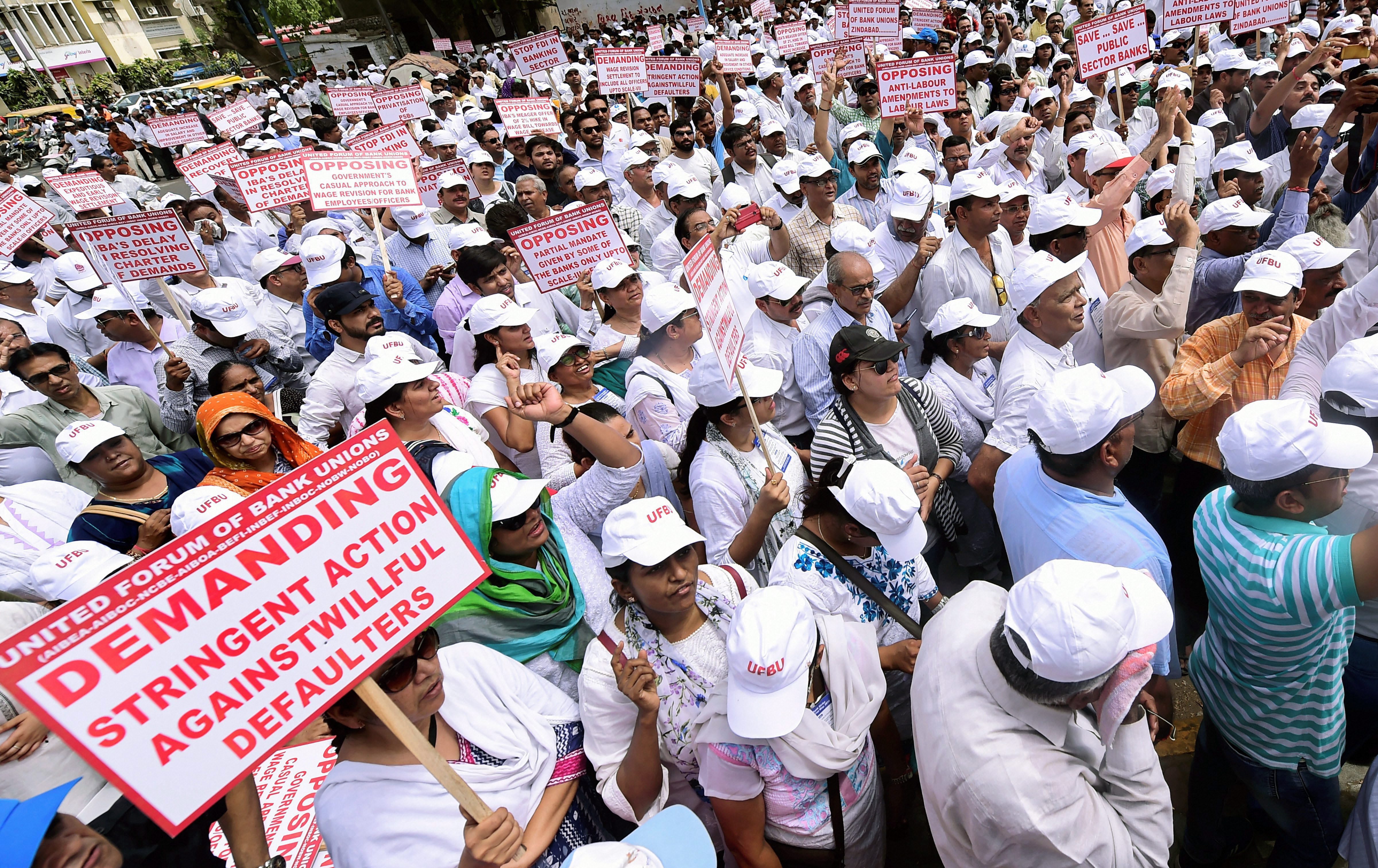 Bank employees hold a demonstration as part of their two-day nationwide strike to press for wage revision in Patna. (Source: PTI)