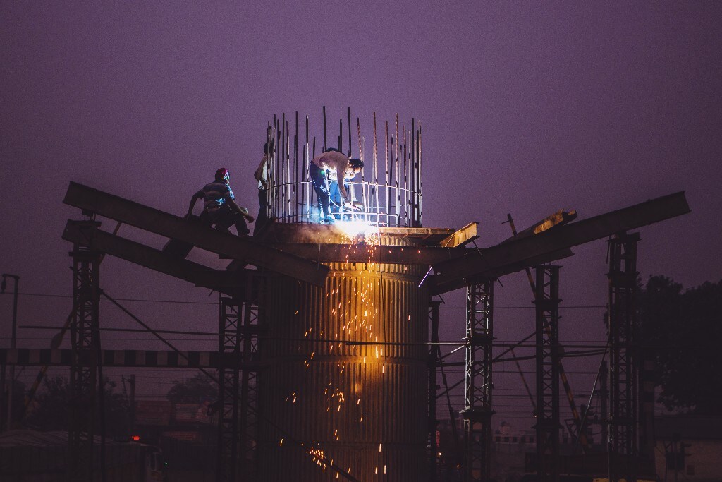 Workers labor at the construction site of a railway bridge in Dadri, Uttar Pradesh.(Photographer: Prashanth Vishwanathan/Bloomberg)