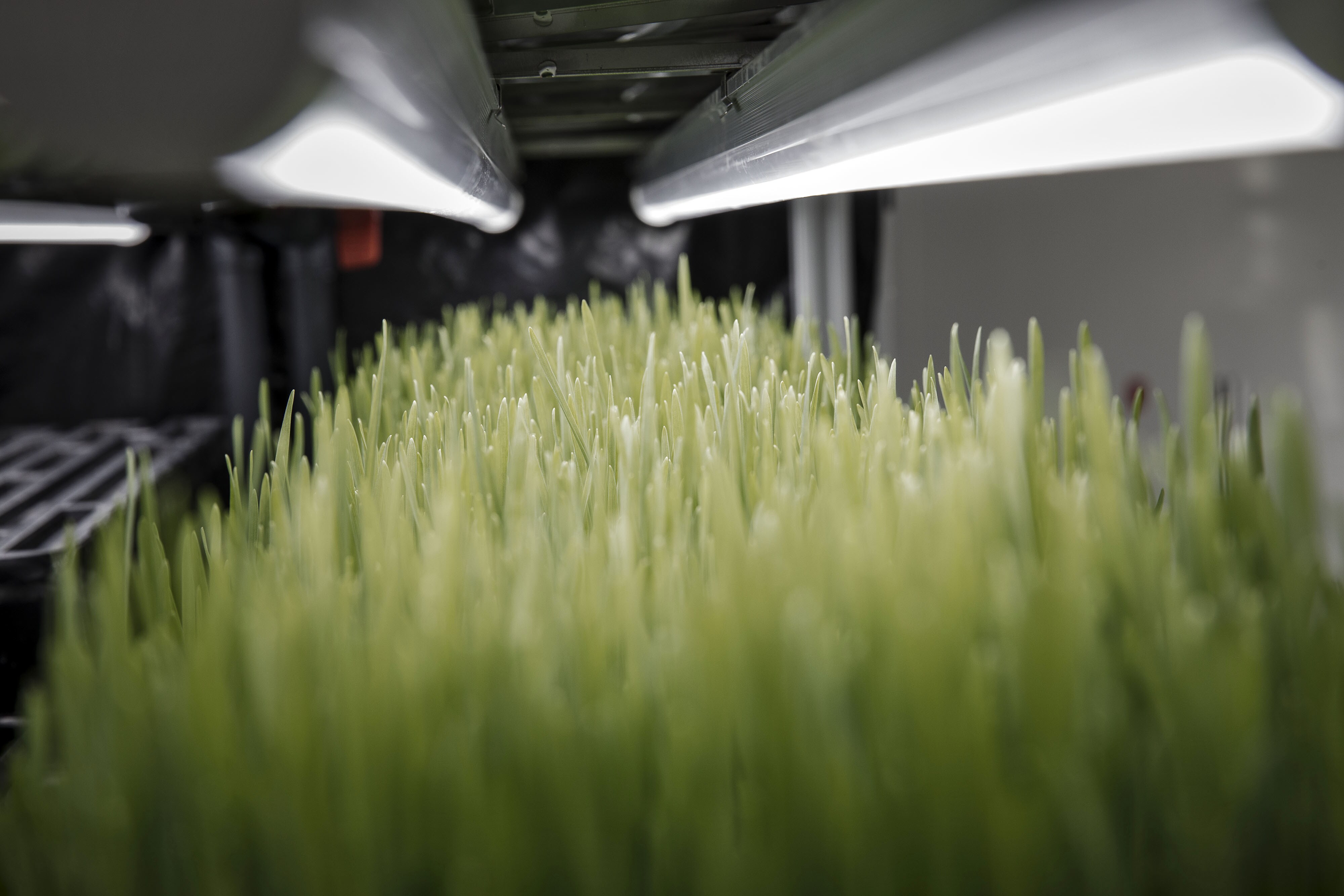 Trays of wheat grass grow in an urban vertical farming unit operated by Alesca Life Technologies in Beijing, China, (Photographer: Qilai Shen/Bloomberg)