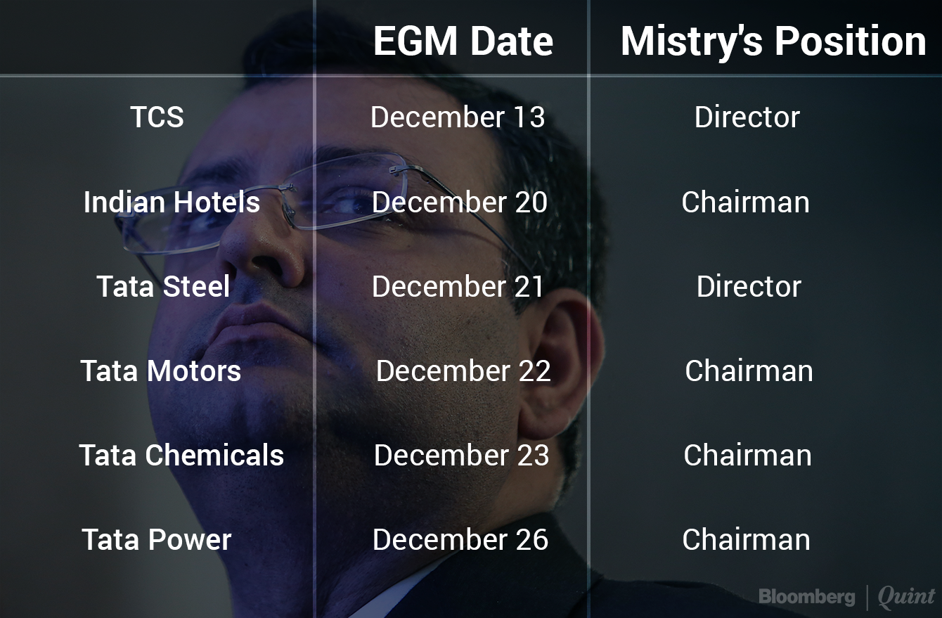 On Tuesday, December 13, at 3.30 pm, the board of Tata Consultancy Services Ltd. will seek shareholders' approval to oust former chairman Cyrus Mistry as director of the company. The extraordinary general meeting is the first of many this month that will determine Mistry's future at the Tata Group.