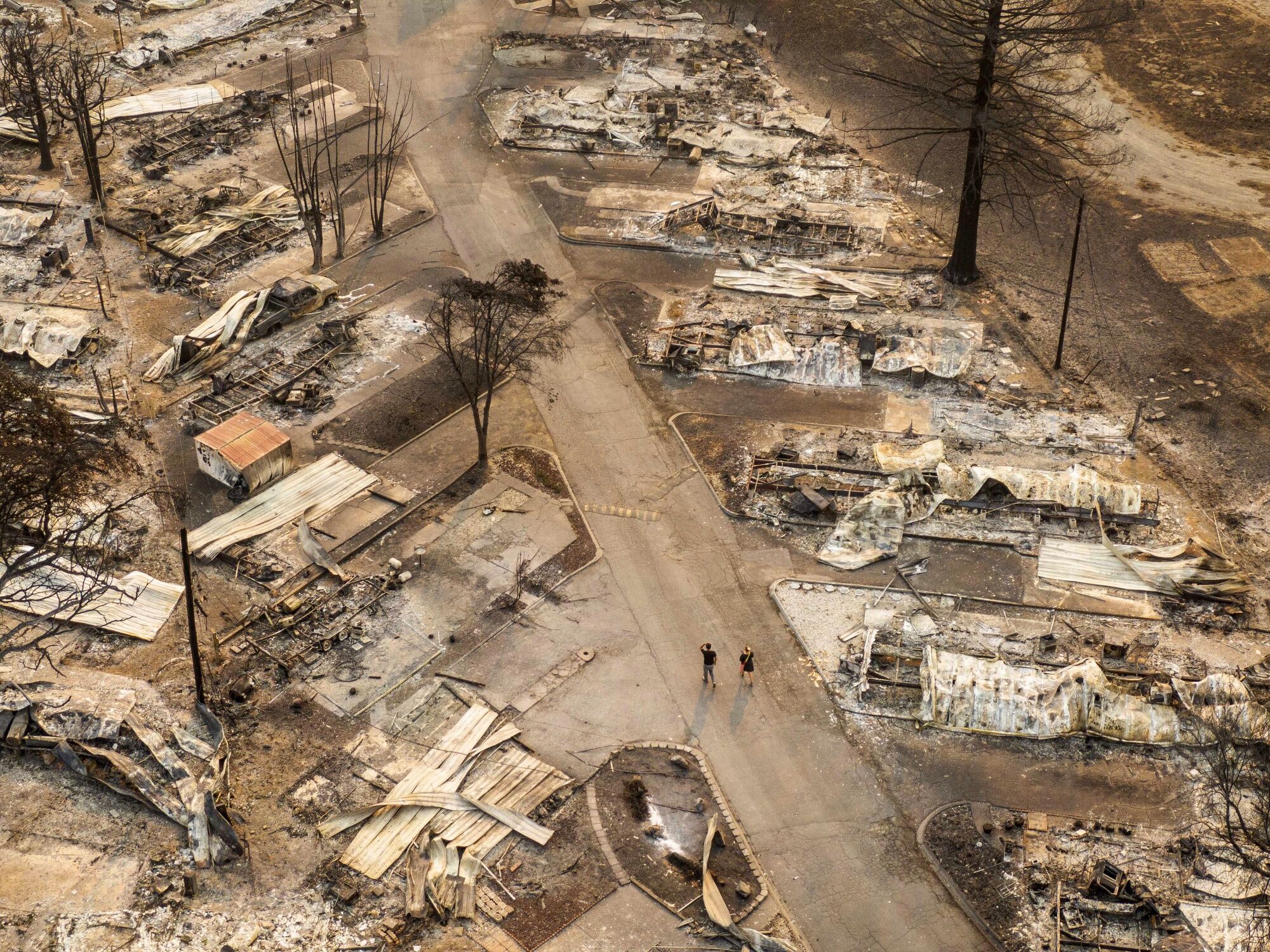 In this aerial view from a drone, people walk through a mobile home park destroyed by fire on September 10, 2020 in Phoenix, Oregon. Hundreds of homes in the town have been lost due to wildfire. (Photo by David Ryder/Getty Images)