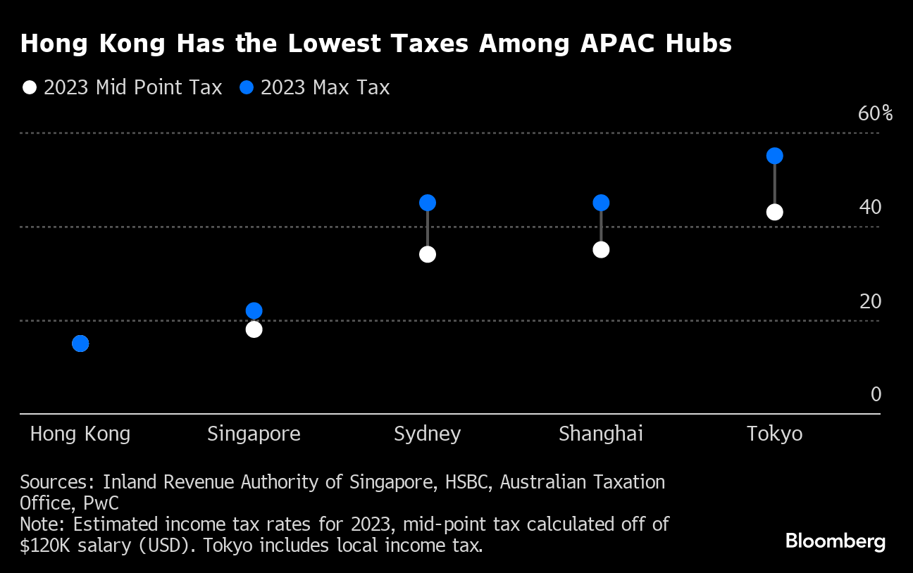 While geopolitics has put some potential residents off, Hong Kong offers the lowest personal income tax rate and biggest expected pay bump among the five cities. That means more take-home pay.