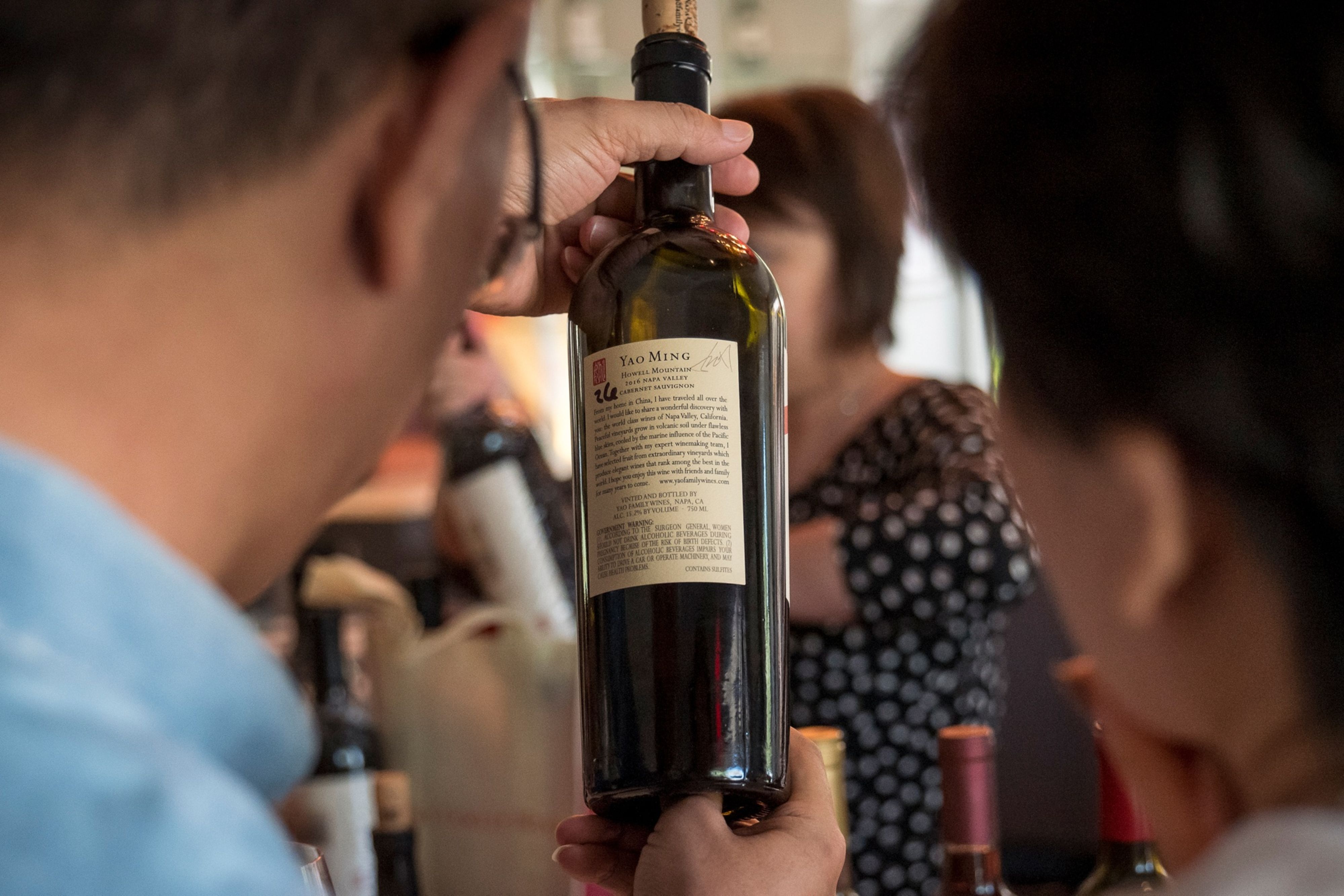 A visitor reads a label on a bottle of Cabernet Sauvignon at the Yao Family Wines tasting room in St. Helena, California, U.S. (Photographer: David Paul Morris/Bloomberg)