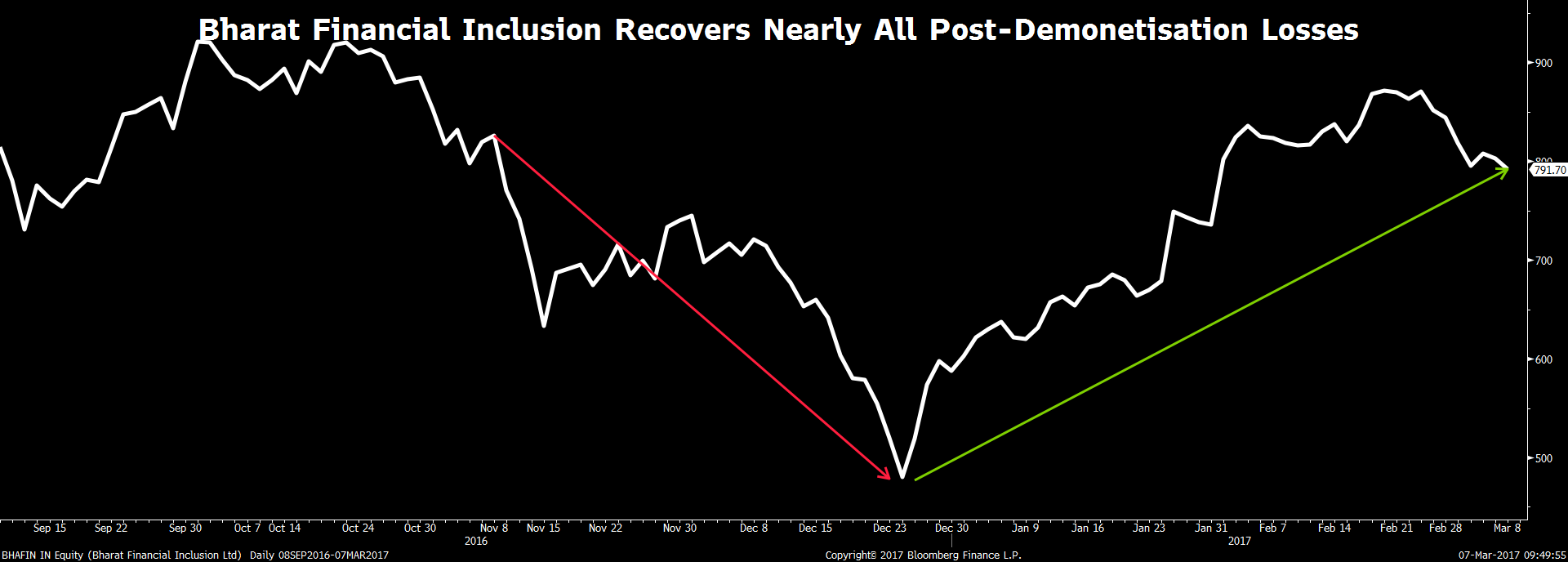 Another brokerage, Antique Institutional Equities, however said in its report that the demonetisation shock has subsided and even if Bharat Financial is unable to recover its dues, it will only bear a one-time credit cost of 4 percent.