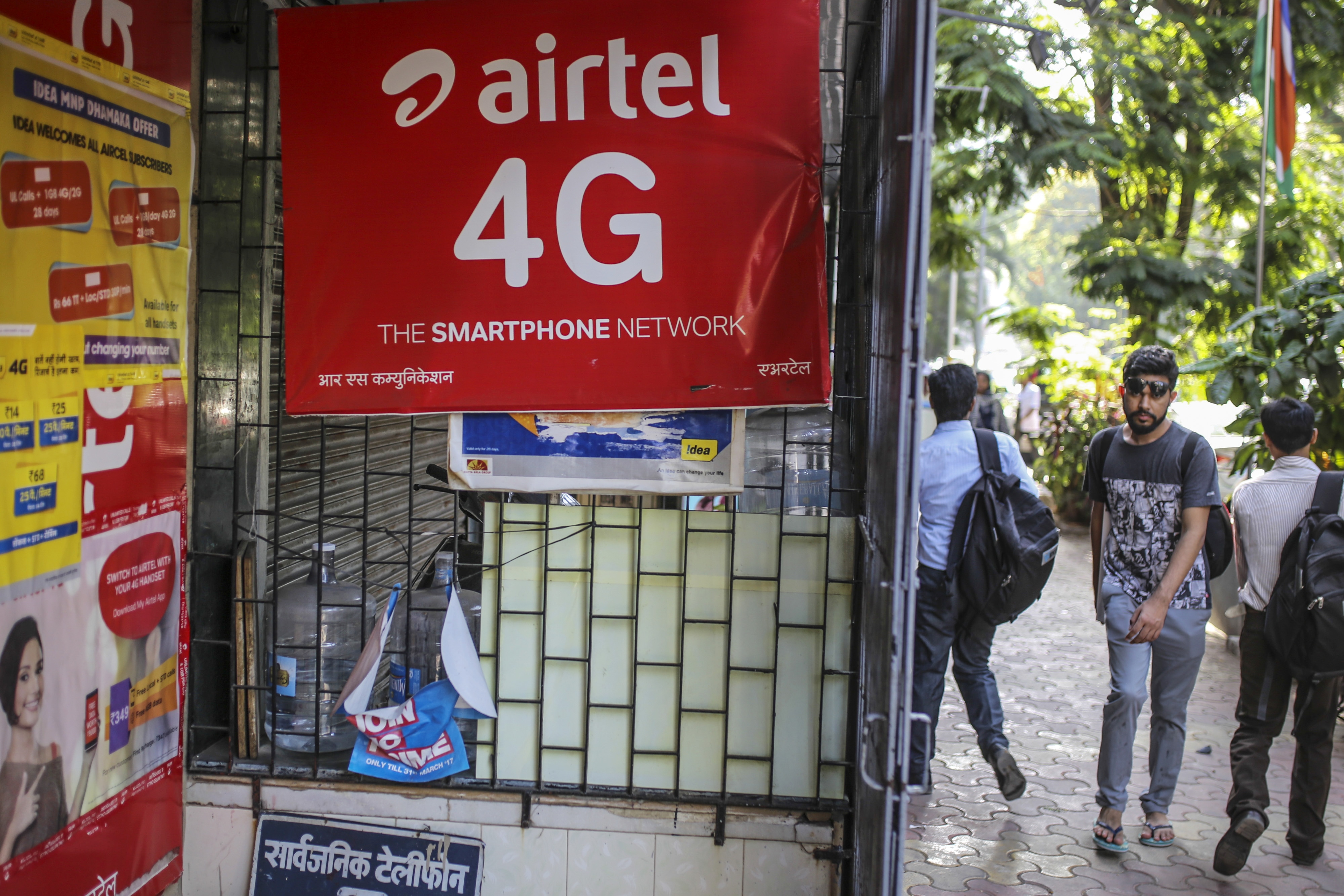 Pedestrians walk past an advertisement for Bharti Airtel Ltd. in Mumbai. (Photographer: Dhiraj Singh/Bloomberg)